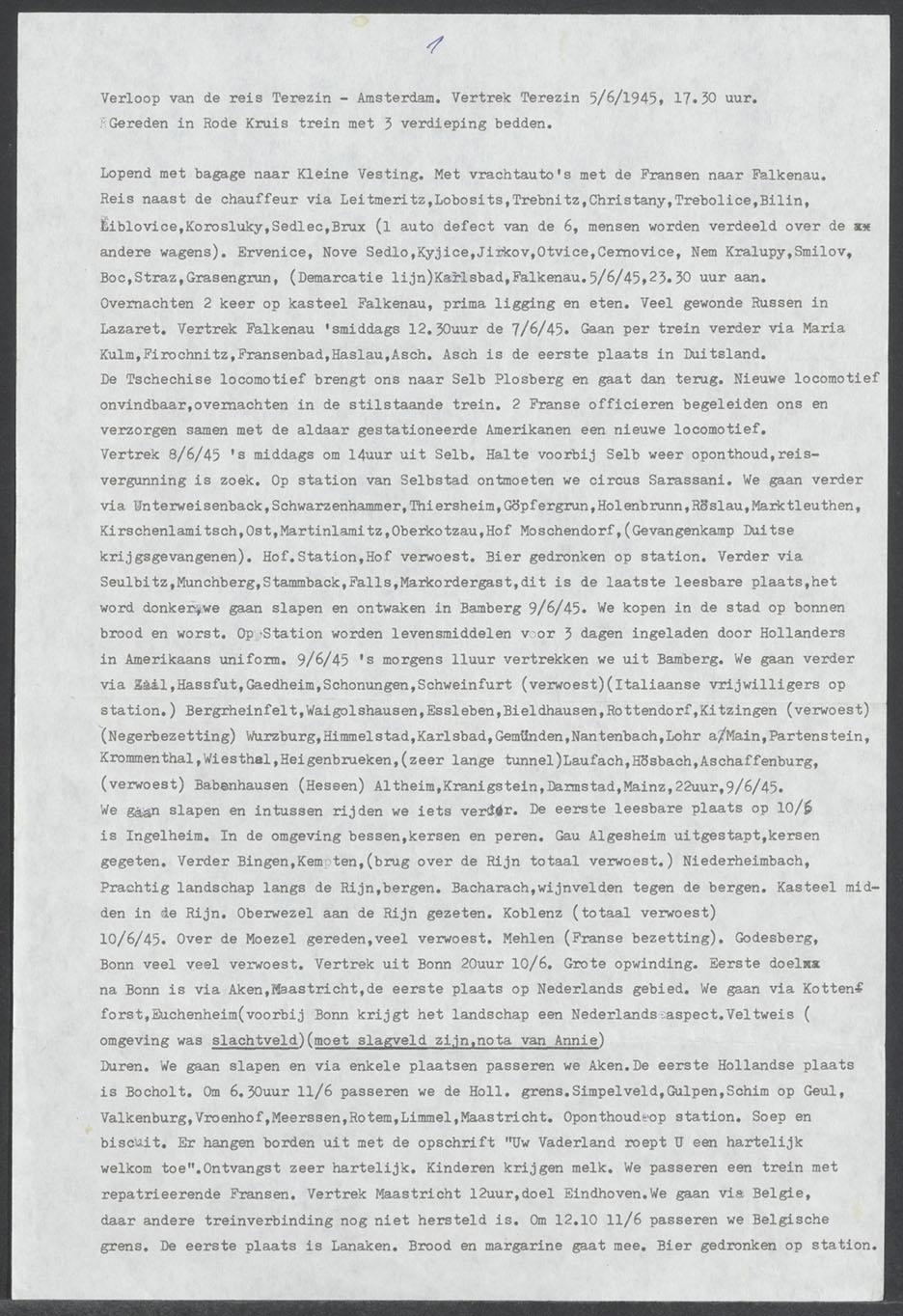 Reisverslag van L. Blom-Walg over haar tocht van Theresienstadt naar Amsterdam, 1945