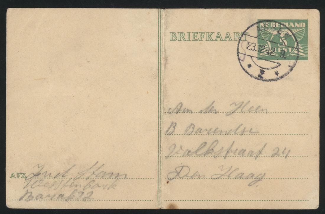 Bevat: - briefkaart aan dhr. Stam, Spinozastraat 49 in Den Haag, van zijn moeder uit (kamp?) Amersfoort, ongestempeld, ongedateerd - briefkaart van Joseph (?) Stam uit Westerbork aan dhr. B. Barendse, Valkstraat 24, den Haag, 23-12-1942 - briefkaart van Trees en Nico Buijtekant vanuit de trein naar Westerbork, 31-3-1943, aan familie Barendse, Falkstraat 24, Den Haag - briefkaart van Bernard Barendse aan zijn vader Izaak Jacob Barendse, Parkstraat 39, Den Haag, 10-09-1934 - paspoort van Izaak Jacob Barendse (1873-1936), afgegeven 4 -12-1924 - gelukstelegram uit Arnhem, 18-3-1942, t.g.v. 'uw voorgenomen huwelijk' - brief van kinderen aan hun moeder, t.g.v. haar 60ste verjaardag, niet compleet, zonder datum - toegangskaart voor de verpleegde mw. Barendse-Stam, Gemeenteziekenhuizen van 's Gravenhage, 13-6-1944.