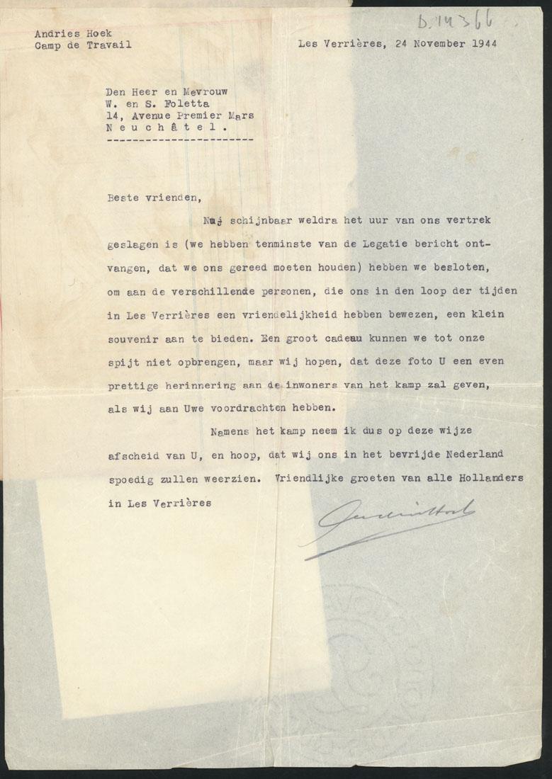 Brieven (2) uit de werkkampen Vevey en Les Verrières in Zwitserland aan het echtpaar Sies en Willy Foletta voor hun optreden in deze kampen, 1944