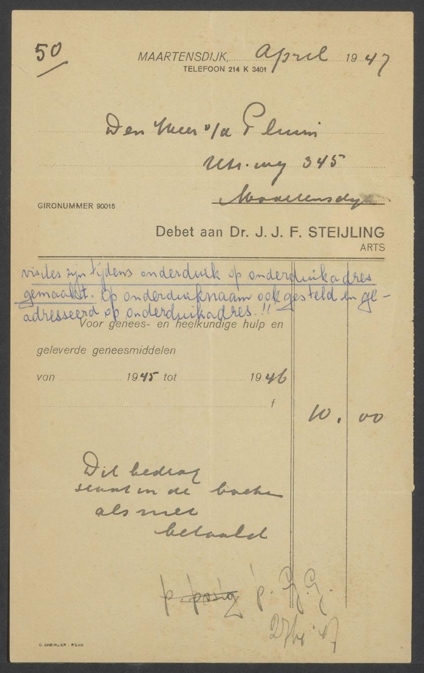 Rekening van Dr. J.J.F. Steijling voor artsbezoek (in de oorlog), op naam van de heer Van der Pluym, april 1947