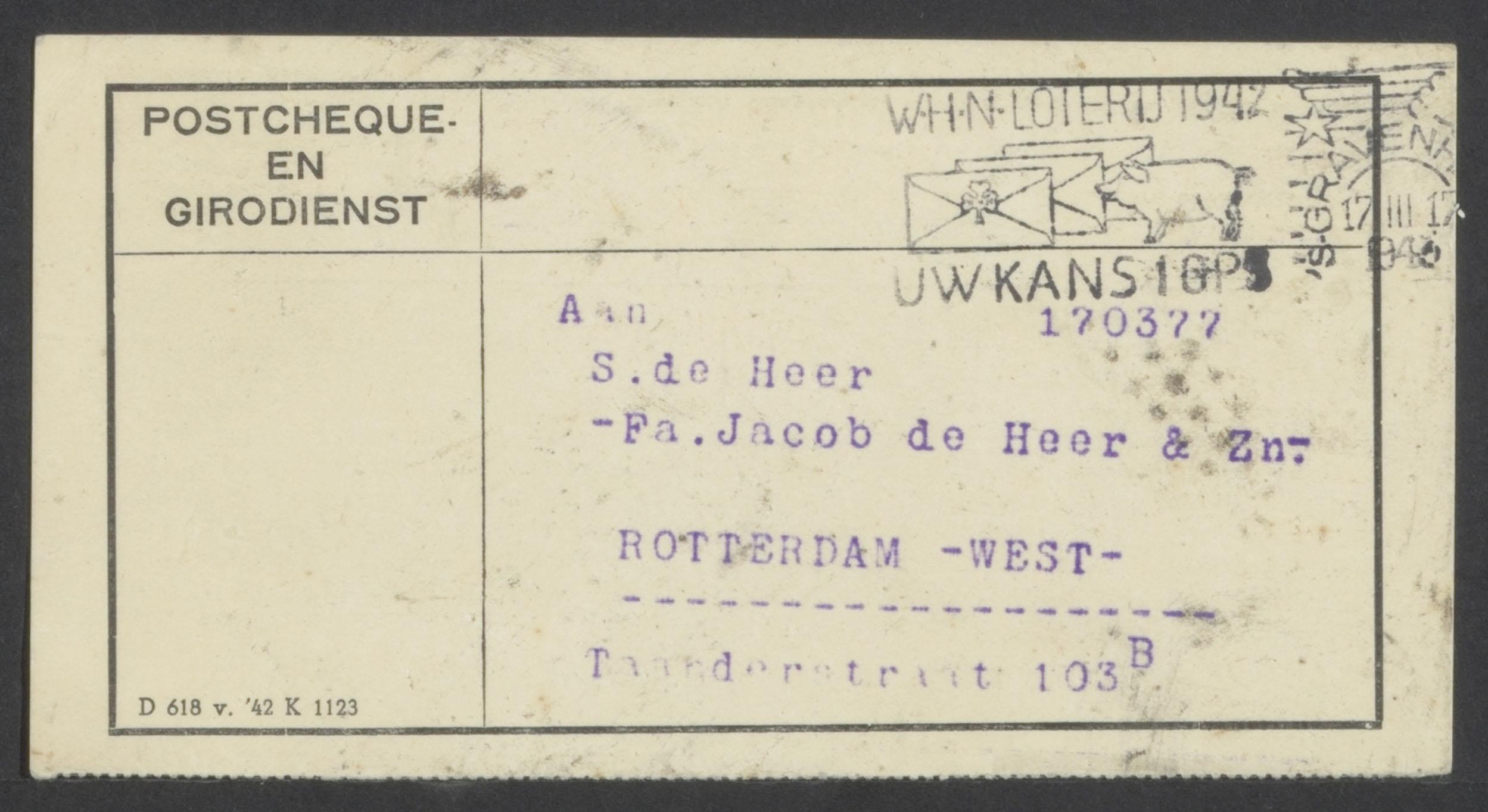 Kaart van de postcheque en girodienst gericht aan S. de Heer met daarop uitleg en verzoek tot het bekendmaken van de al dan niet joodse identiteit van houders van postrekeningen, maart 1943