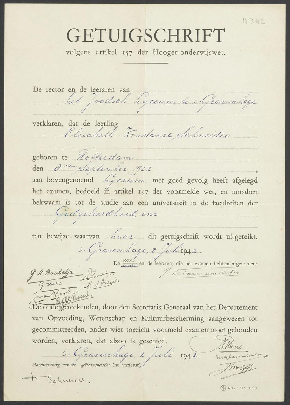Diploma van het Joods Lyceum in Den Haag ten name van Elisabeth Konstanze Schneider, 1942
