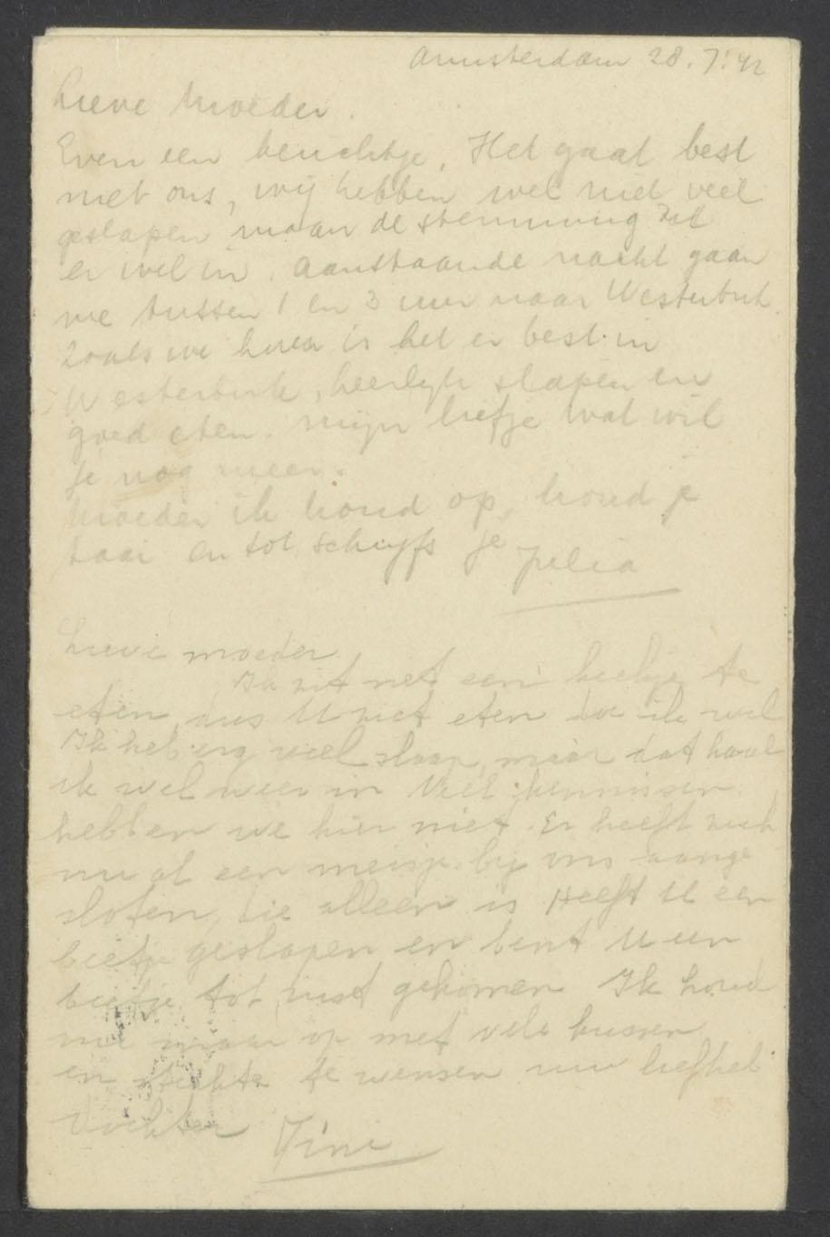 Briefkaarten (2) van de tweeling Catharina (Tini) en Julia Koekoek uit Amsterdam en Westerbork aan hun moeder mevr. Grietje Koekoek-Schatz, 1942
