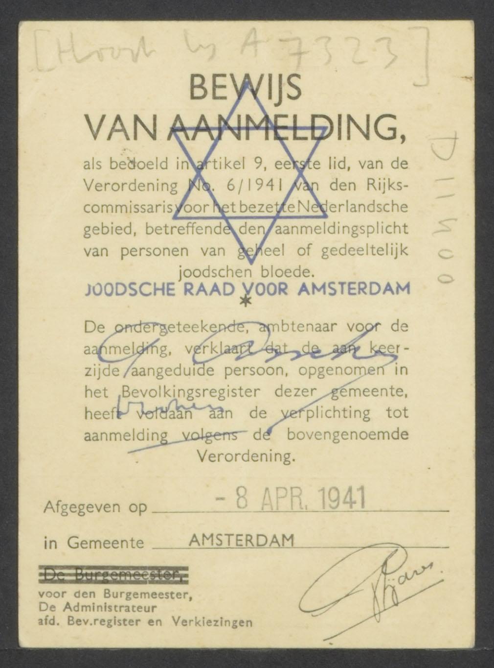 Aanmeldingsbewijs als geheel of gedeeltelijk joods persoon ten name van Regina Poons, 1941