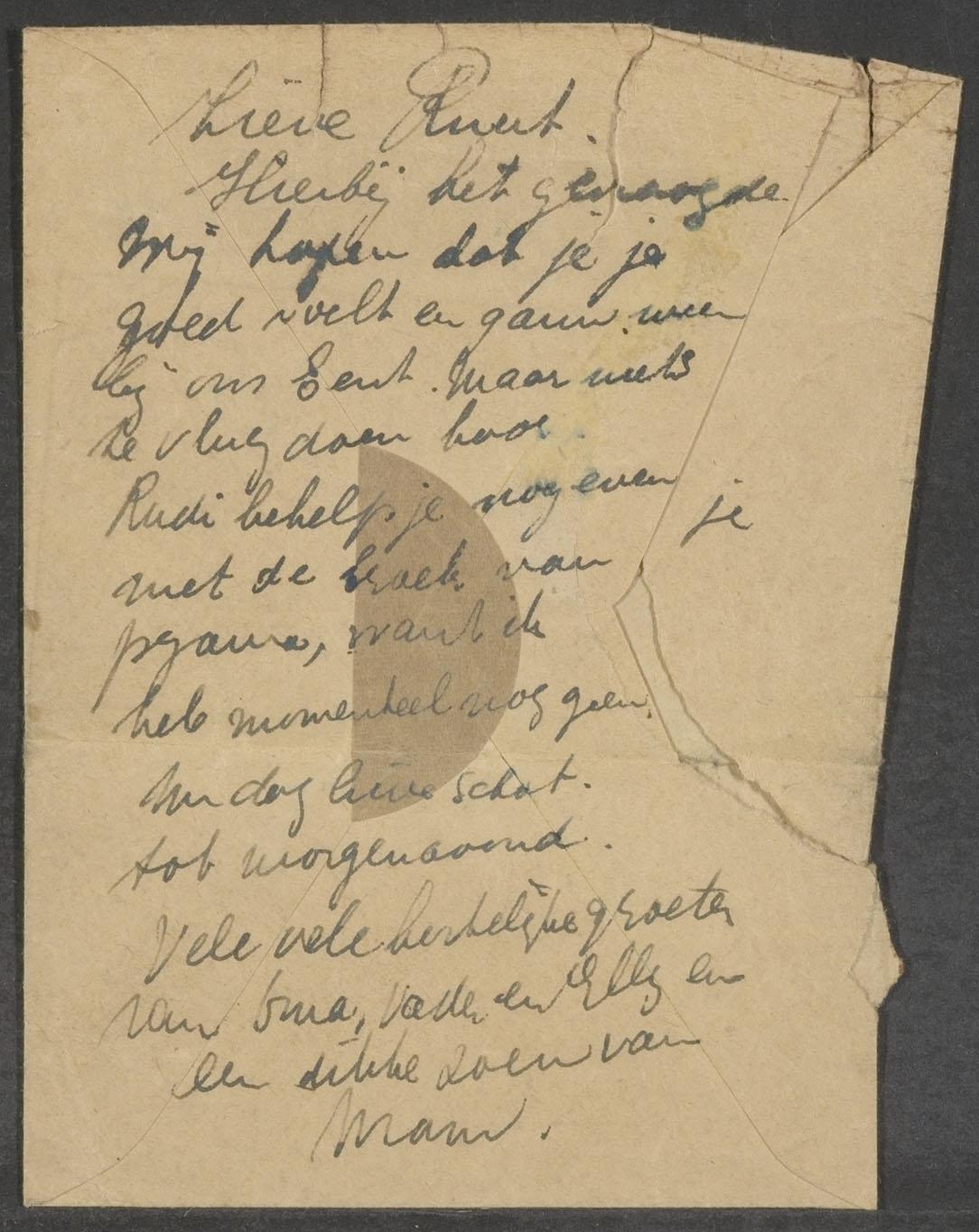 Briefje vermoedelijk in Westerbork door Klara Blik-Content geschreven op een enveloppe en gericht aan haar zoon Rudolf, circa 1943