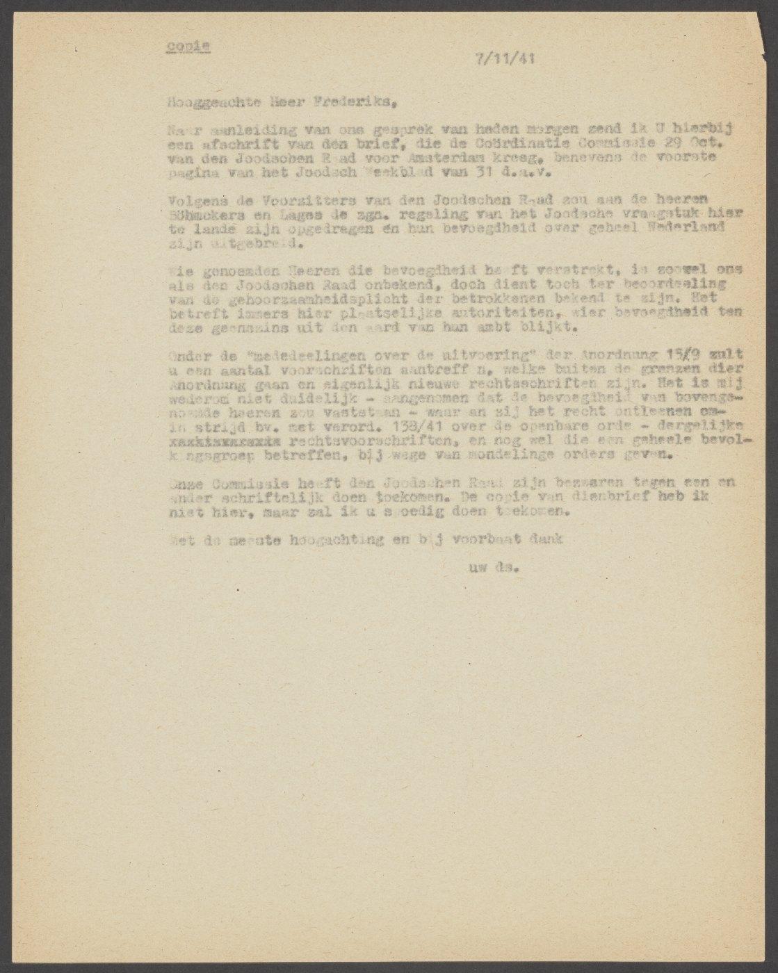 De briefwisseling omvat twee brieven van Mr. L.E. Visser aan K.J. Frederiks gedateerd 7-11-1941 en 18-11-1941 en een brief van Frederiks aan Visser, d.d. 5-12-1941. Bij de brieven van Visser zijn gevoegd twee door hem opgestelde nota's voor Frederiks waarin hij protesteert tegen de anti-joodse maatregelen van de bezetter. De nota's zijn van 25-11-1941 en van 24-1-1941.