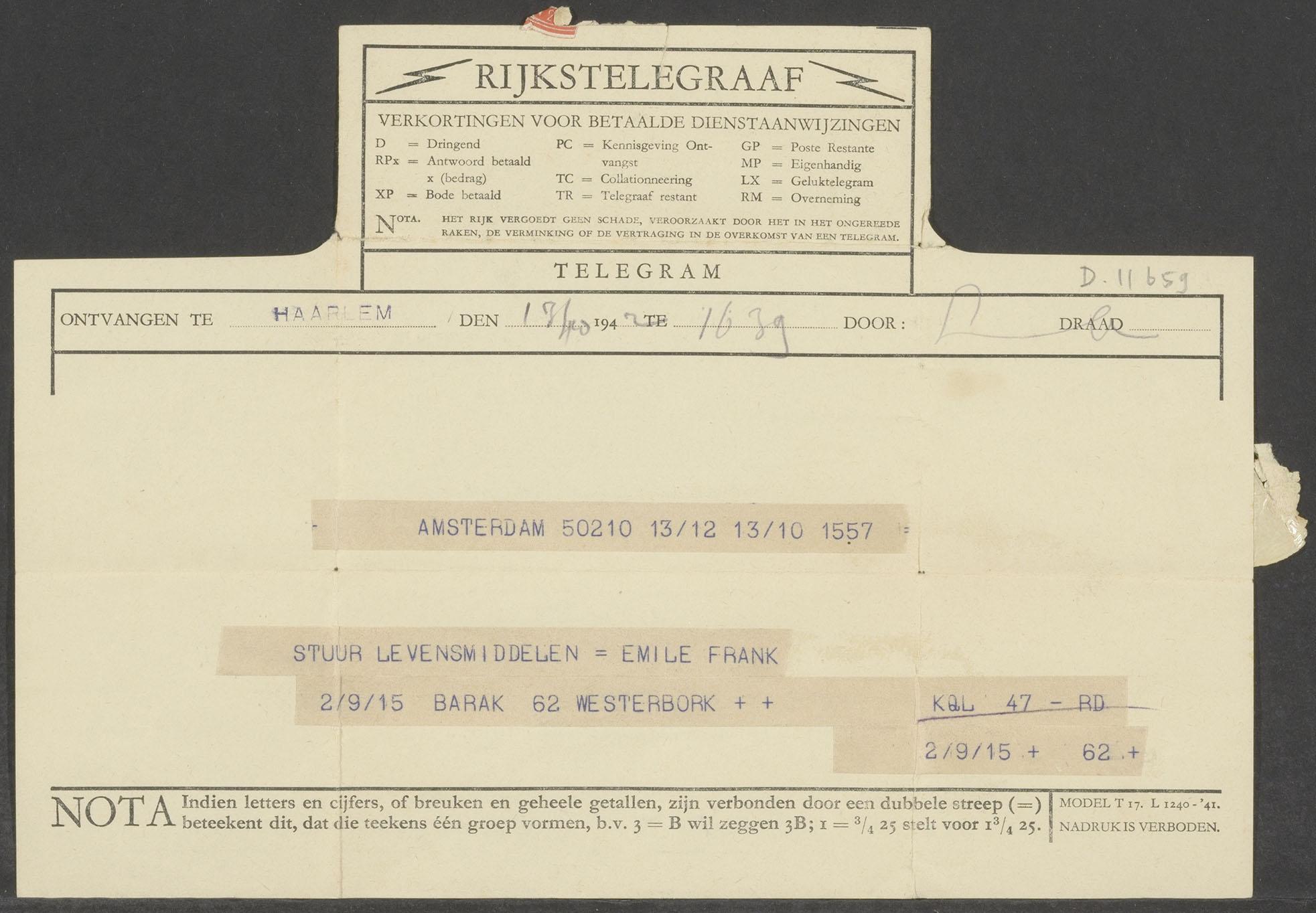 Telegram van Emile Frank uit Westerbork aan Jan Pielage met verzoek om levensmiddelen, 1943
