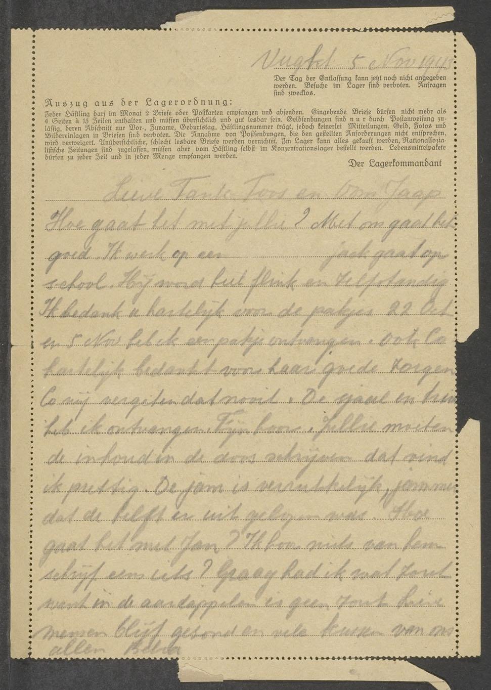 Brief van Belia Marcus-van Gich vanuit kamp Vught aan de familie van Gich in Rotterdam, november 1943