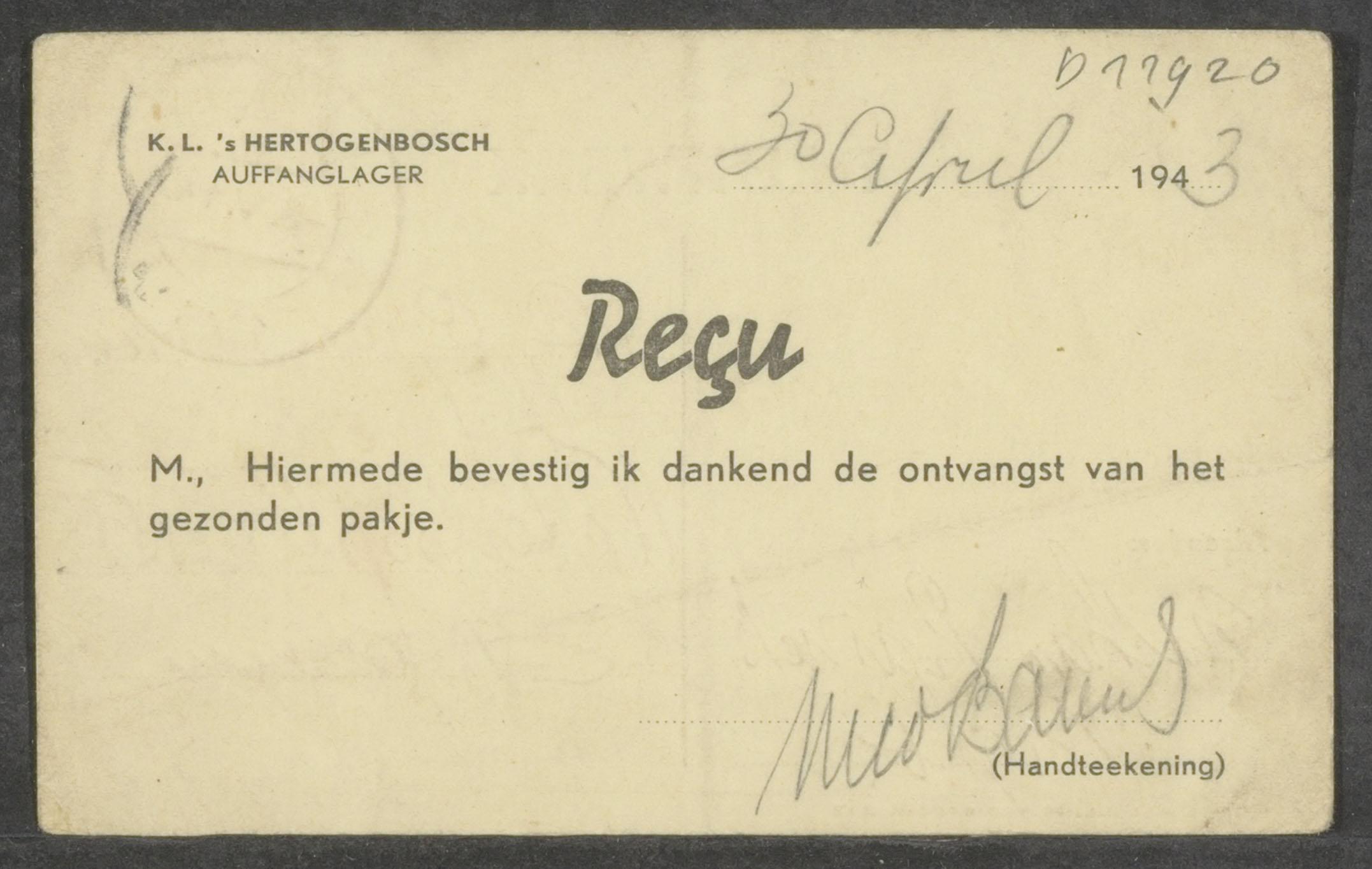 Briefkaart waarmee de ontvangst van een pakketje in kamp Vught werd bevestigd, door Nathan Baruch gestuurd aan de familie Groenteman in Amsterdam, 1943