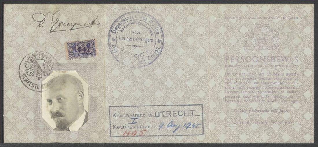 Persoonsbewijs van Dietrich Gomperts waaruit de letter "J" verwijderd is, alsmede een correspondentiekaartje waarin hij aankondigt zijn praktijk te moeten sluiten, 1941