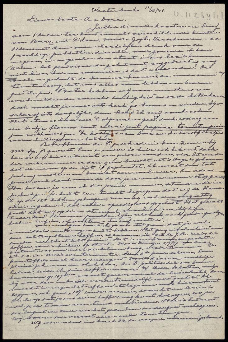 Brieven (8), briefkaarten (4) en ontvangstbewijzen (5) van Mozes Konijn en zijn vrouw Bloeme Konijn-Booleman aan zijn zoon Abraham August Konijn en diens vrouw Dora, 1943