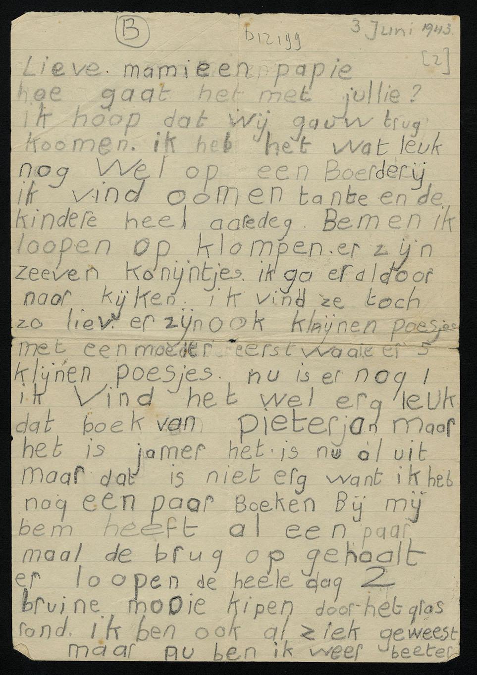 Brieven (32) van de kinderen Bernie en Jacoba Vet vanuit de onderduik aan hun ouders Max Vet en Anna Jacoba Pinto, 1943-1944