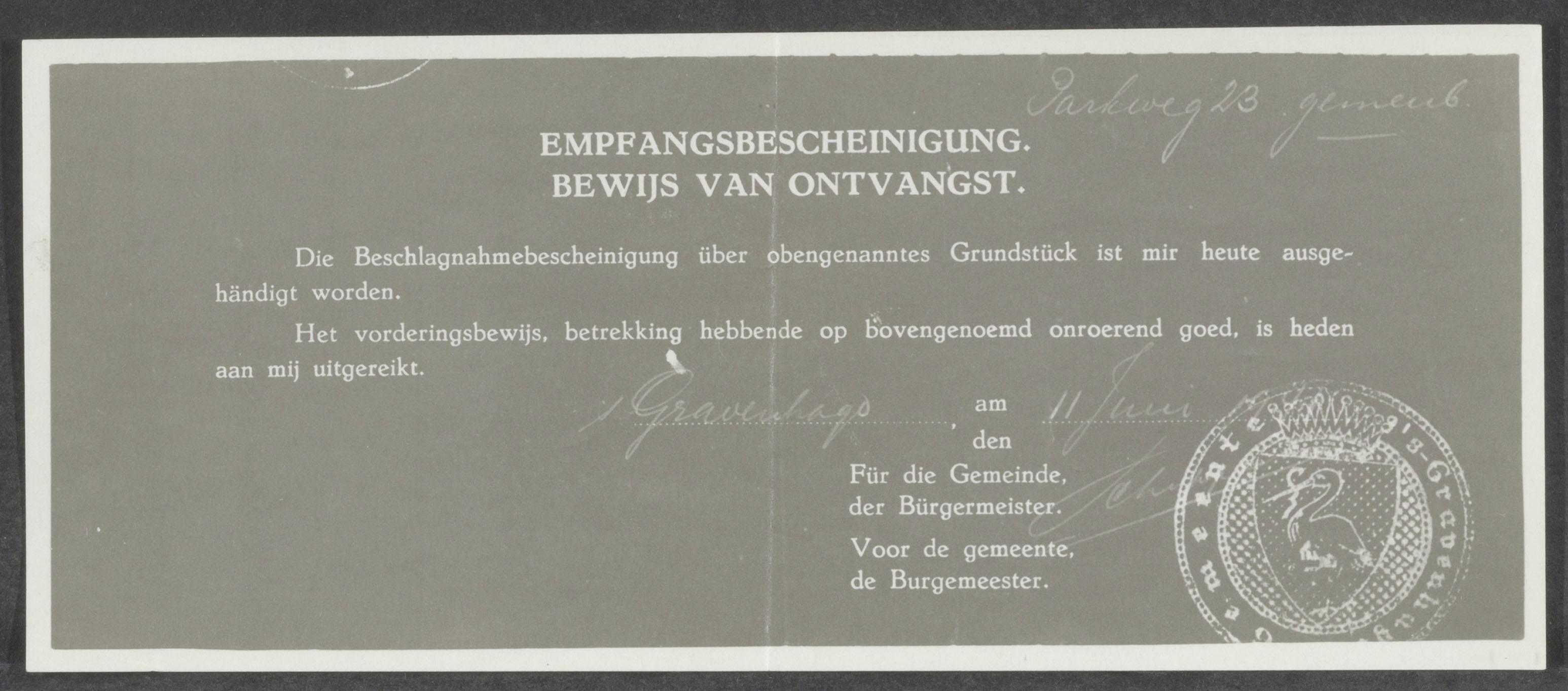Fotokopie van bewijs van ontvangst met betrekking tot in beslag genoemen onroerend goed op het adres Parkweg 23 in Den Haag, ca. 1941