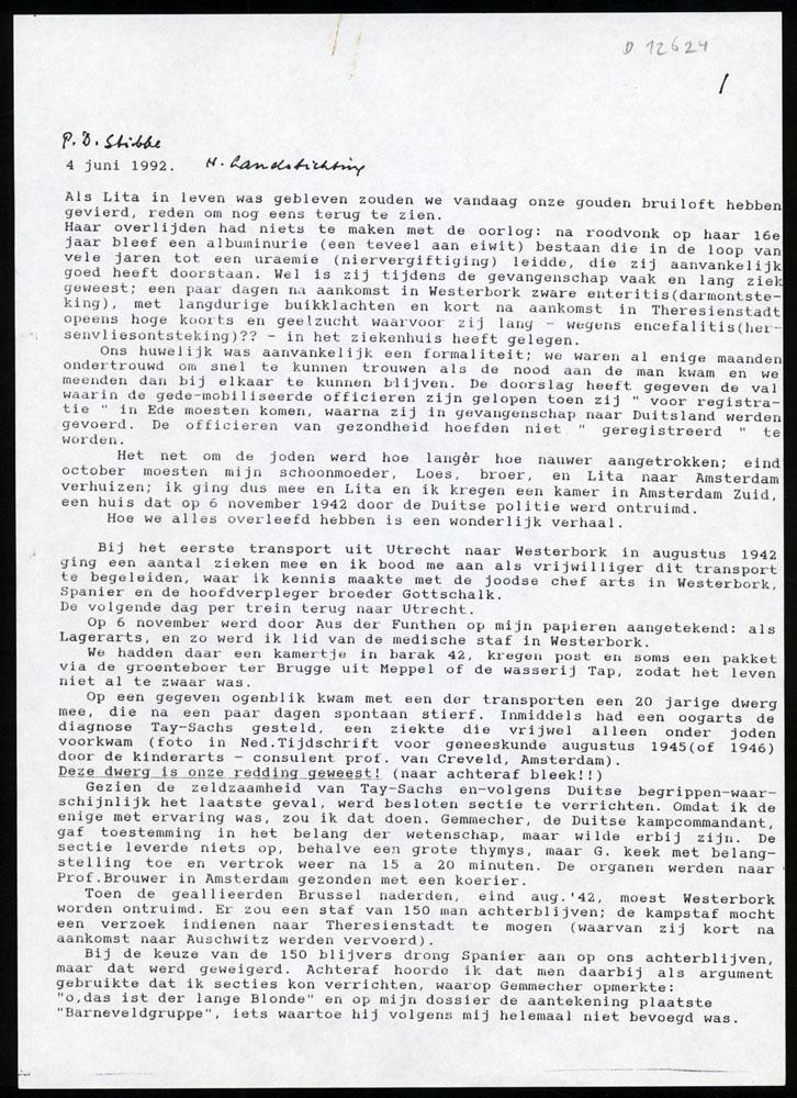 Typoscript met oorlogsherinneringen van Paul Dagobert Stibbe, voormalig kamparts in Westerbork, uit 1992, en brieven (2) die hij in de zomer van 1945 aan zijn echtgenote schreef.
