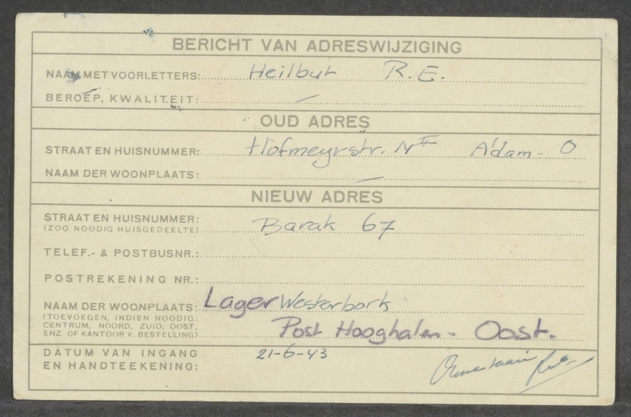 Adreswijziging van Robert Emanuel Heilbut voor zijn verhuizing van Amsterdam naar Kamp Westerbork, 1943