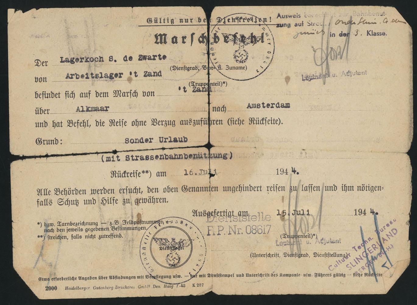 Vergunning op naam van kampkok Salomon de Zwarte, om met buitengewoon verlof vanuit werkkamp 't Zand naar Amsterdam te reizen, met gebruikmaking van de trein, 15 juli 1944