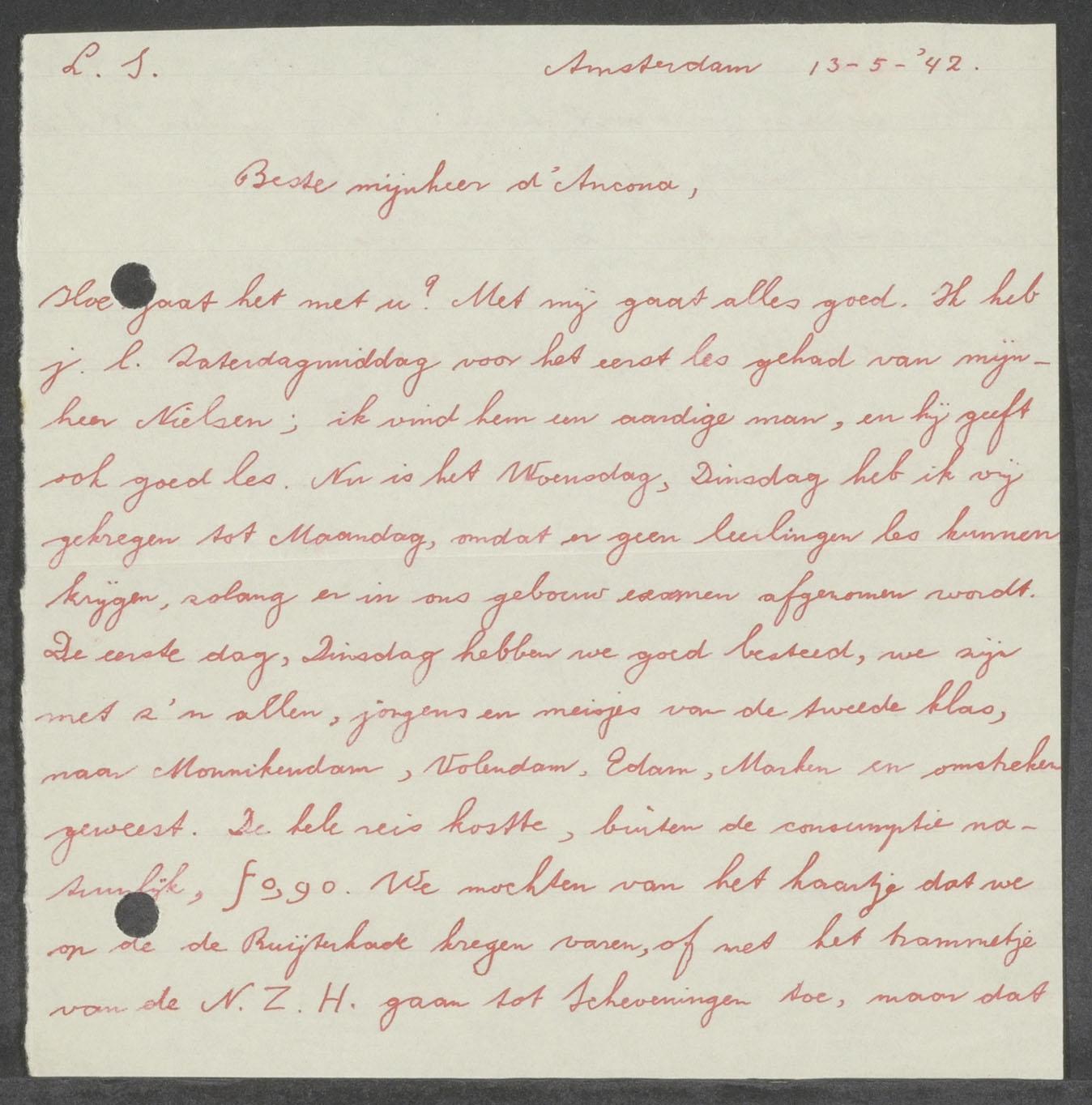 Brief van ene Han (een oud-leerling) aan Rehuel (Felix) d'Ancona (1902-1978) in het werkkamp "De Vecht" bij Dalfsen, 1942