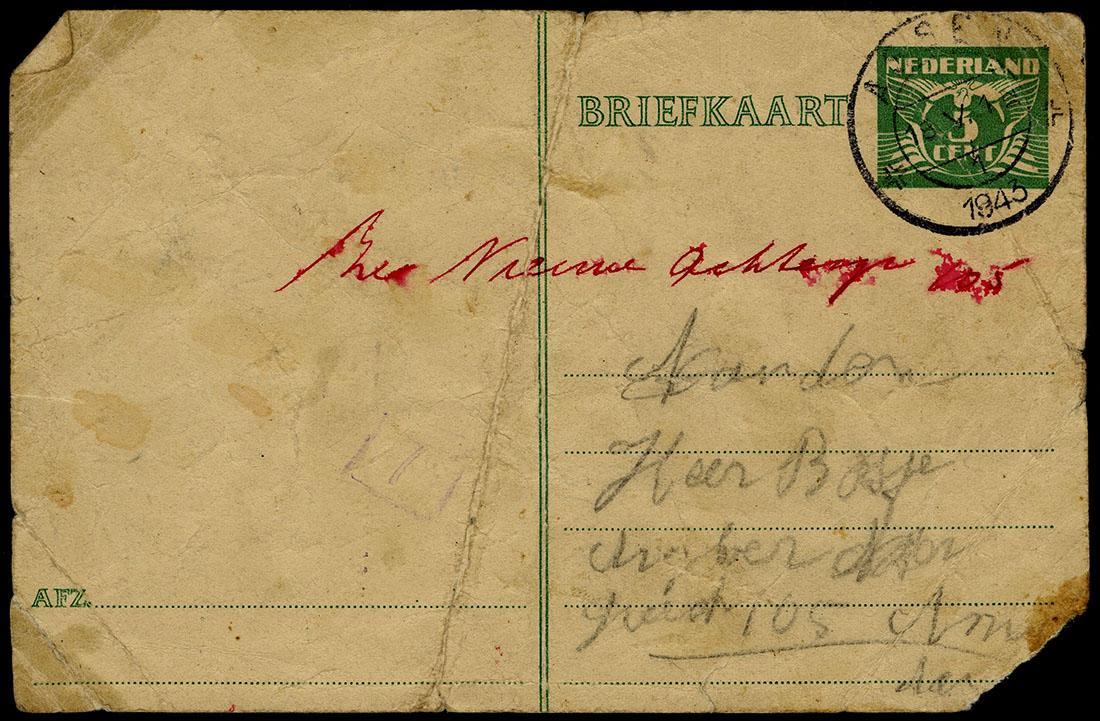 Uit de trein gegooide briefkaart van Simon Buijtekant (artiestennaam: Jean du Béla) (1903-1943) en zijn vrouw Cato (Tootje) Buijtekant-Lever (1906-1943), 1943