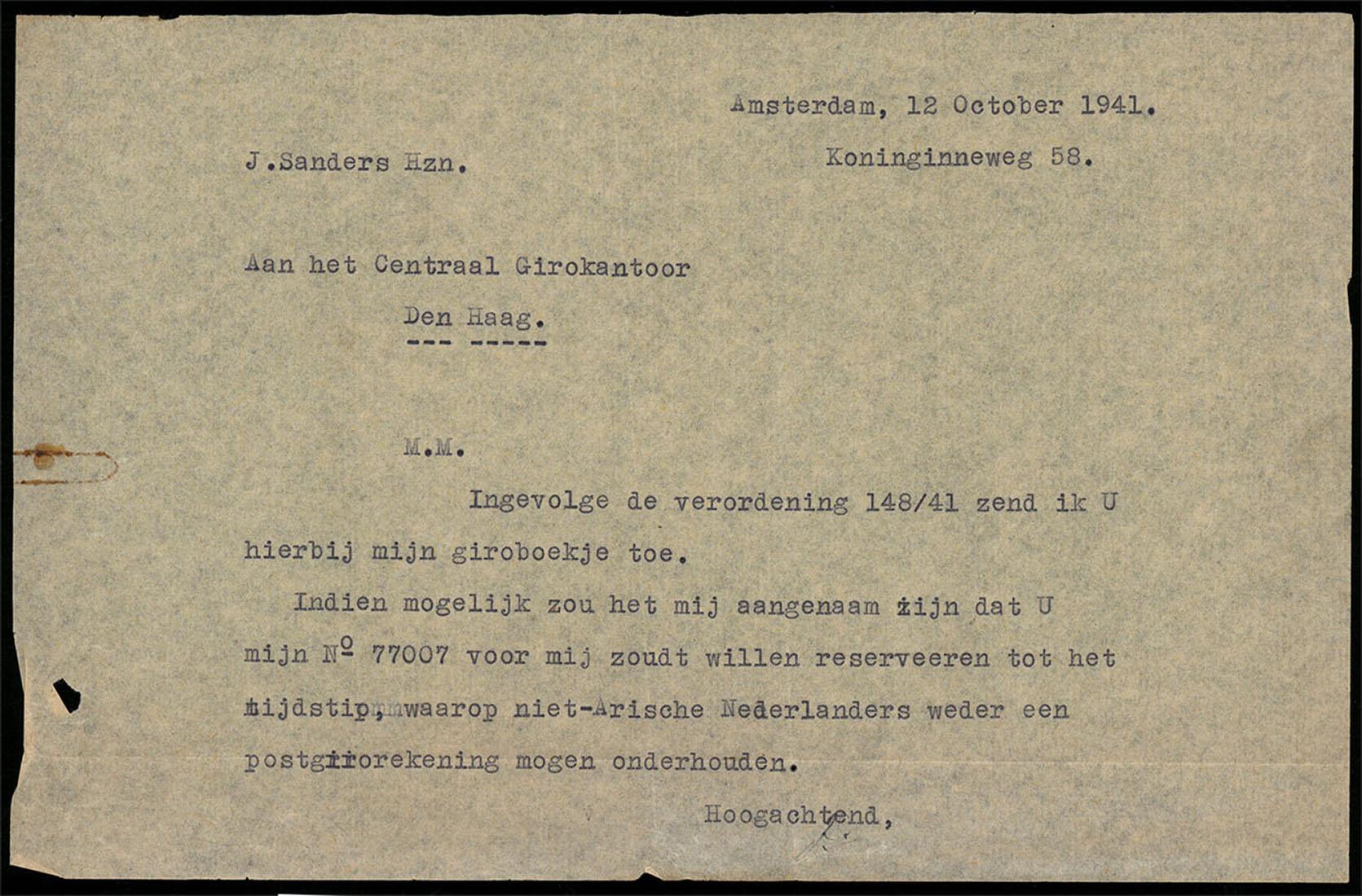 Omvat: 1. Circulaire Joodse Raad aan J. Sanders, m.b.t. tewerkstelling, januari 1942. 2. Brief m.b.t. opheffing girorekening als gevolg van anti-joodse maatregelen, met het verzoek een gironummer te reserveren "tot het tijdstip waarop niet-Arische Nederlanders weder en postgirorekening mogen onderhouden", oktober 1941.. 3. Notitieblaadje met berichten van Duitse familieleden van zijn vrouw, sept-nov. 1941. 4. stukken m.b.t. gedwongen ontslag als directeur van de Ned. Aziatische Handelsmaatschappij (nov-dec 1941)
