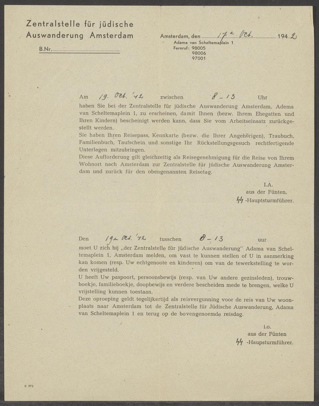 Dit dossier omvat: 1. Oproep d.d. 17-10-1942 van de Zentralstelle om zich te melden voor deportatie (niet op naam). 2. Briefje d.d. 22-9-1943 van Treuhänder Arthur Fischer m.b.t. Samuel Jacobson. 3. Briefje d.d. 3-12-1942 van de Stichting Rosenburg m.b.t. mevrouw Broekhuizen-Zeldenrust. 4. Uittreksel uit het overlijdensregister Den Haag m.b.t. het overlijden Aäron Mol. 5. Brochure over regeringsjubileum Wilhelmina met naam van Alfr. Koster uit Den Haag. 6. Herdenkingsplaat voor de Tweede Wereldoorlog met tekst "Gloria in excelsis Deo".
