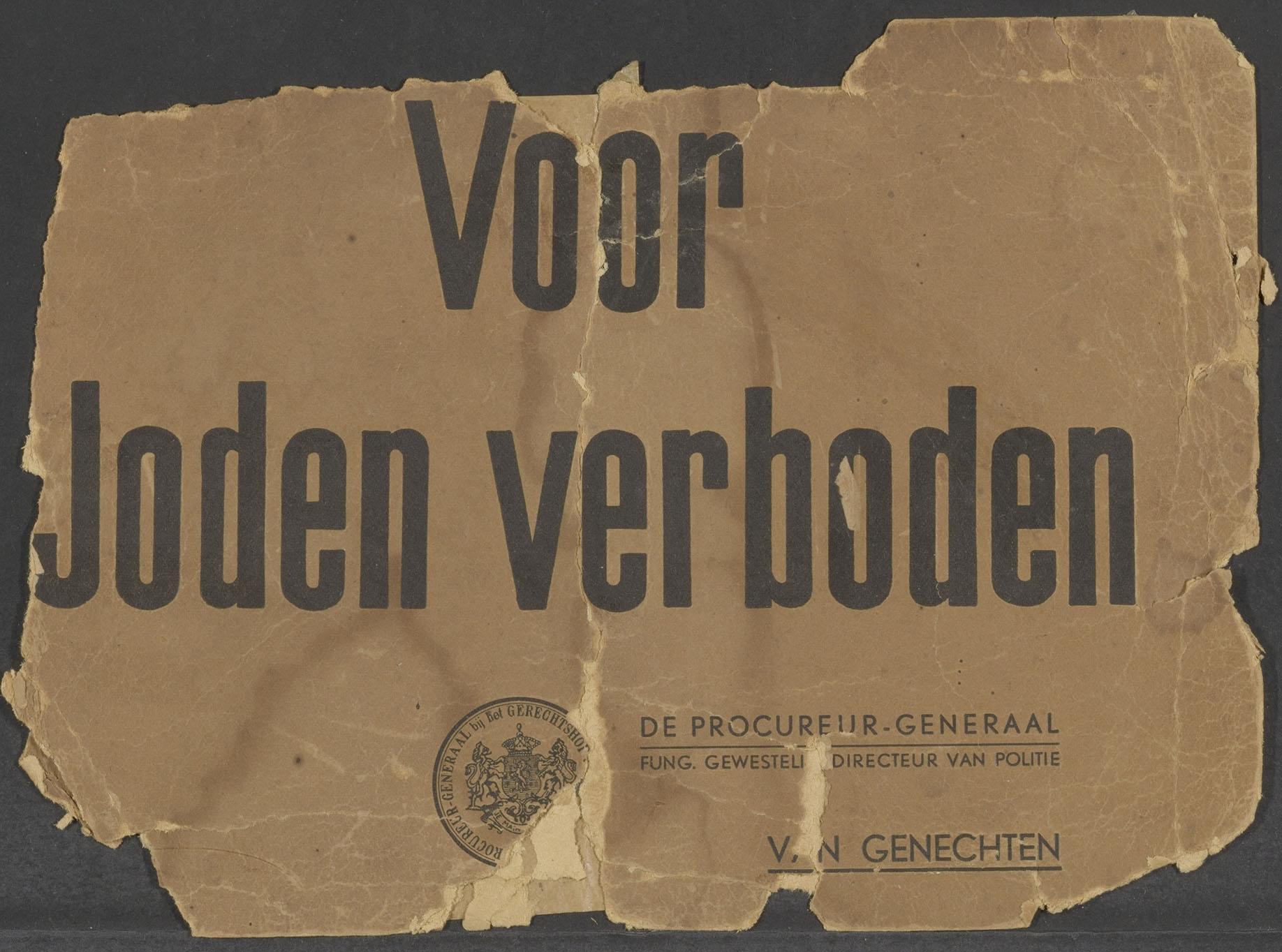 Volledige tekst: Voor Joden verboden / De procureur-Generaal / fung. gewestelijk directeur van politie / Van Genechten. Dit bord was in gebruik bij Café de Vliet aan de Weteringkade 1 in Den Haag.