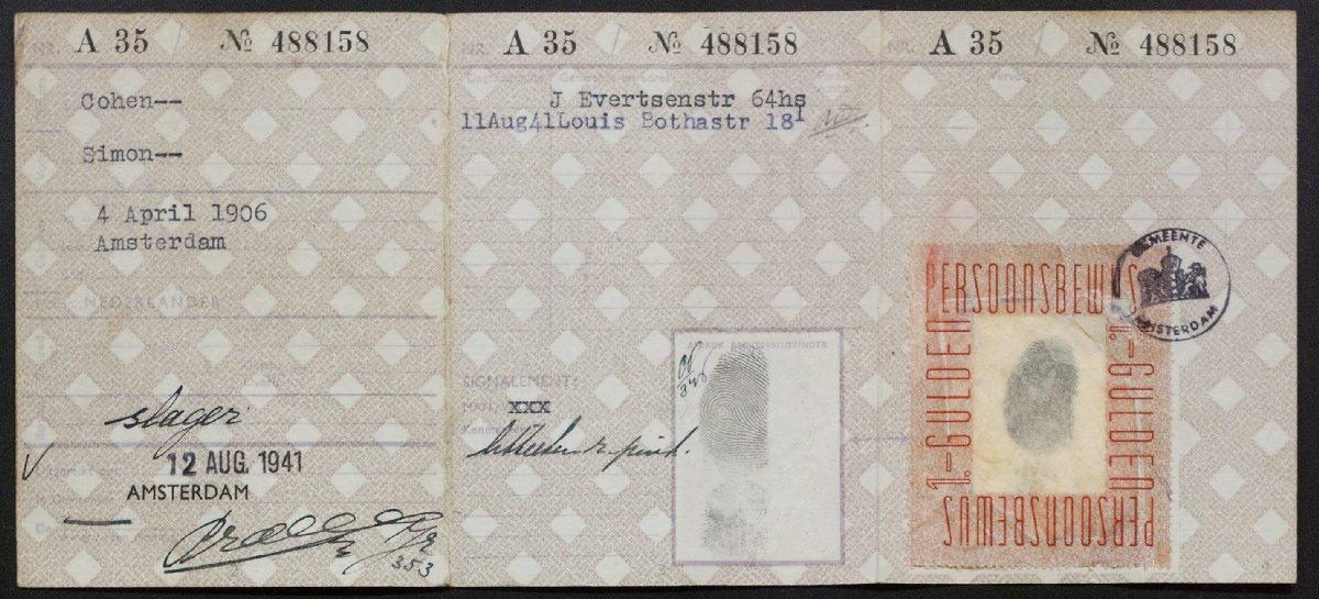 Persoonsbewijs met een J op naam van Simon Cohen van IJssalon Koco, 1941