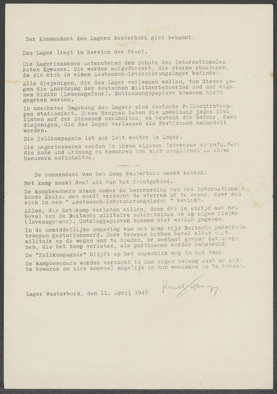 Dossier met verschillende circulaires, kamporders en exemplaren van "De Westerborker" rond de bevrijding van Westerbork uit het bezit van Hermann Gurau en Ina Gurau-Lesser, 1945