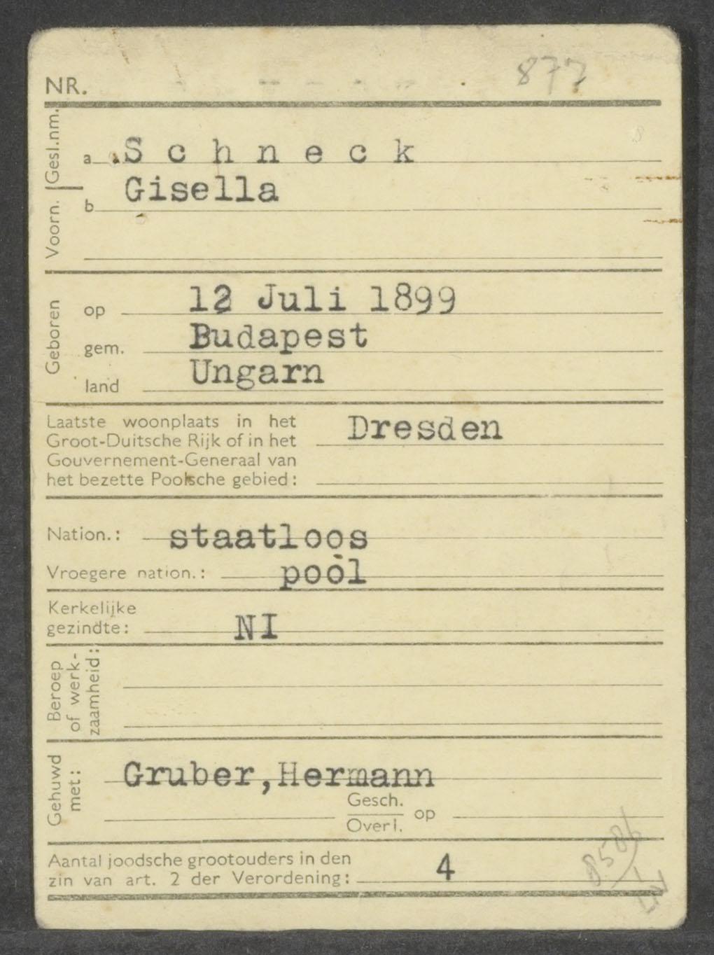 Aanmeldingsbewijs voor 'personen van geheel of gedeeltelijk joodschen bloede' op naam van Gisela Gruber-Schnek en Susanne Heynemann, 1941