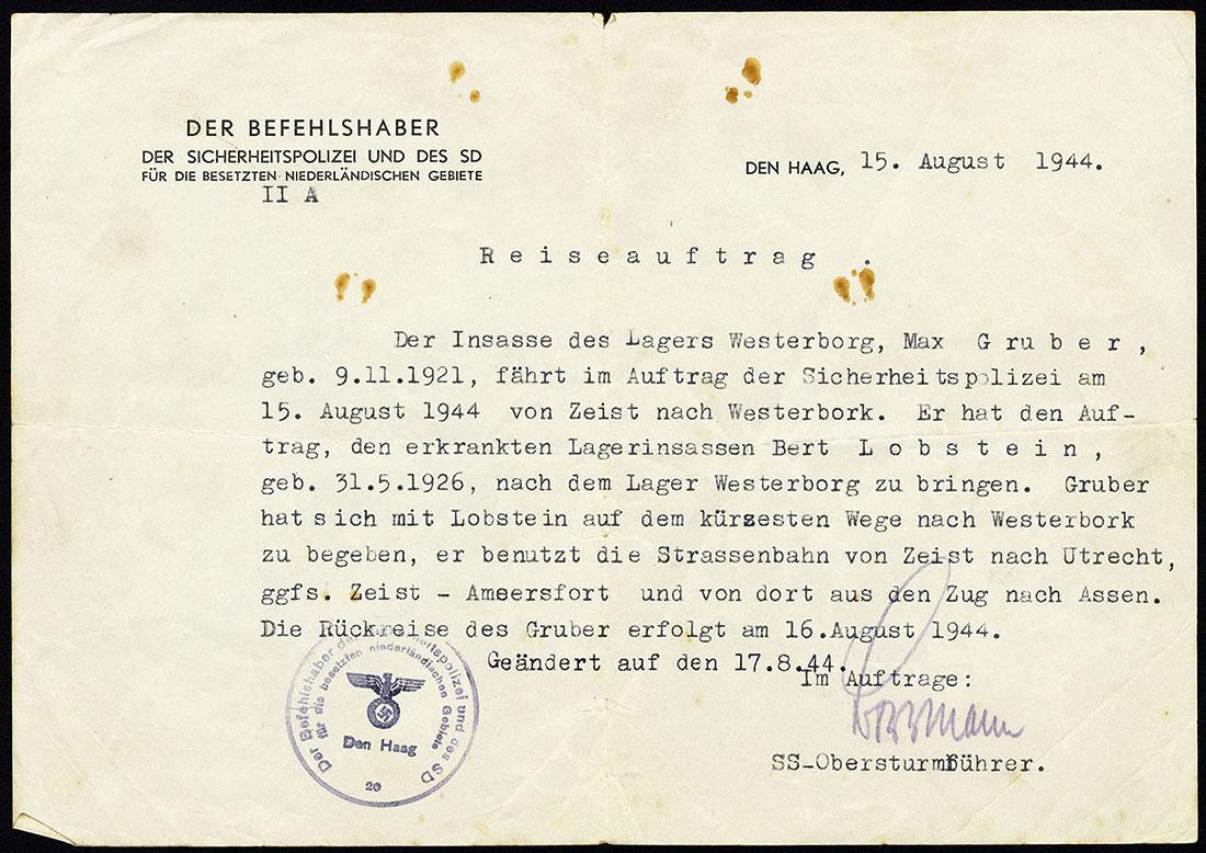 Opdracht van de 'Befehlshaber der Sicherheitspolizei und des SD' aan Max Gruber om van Zeist naar Westerbork te reizen, 1944
