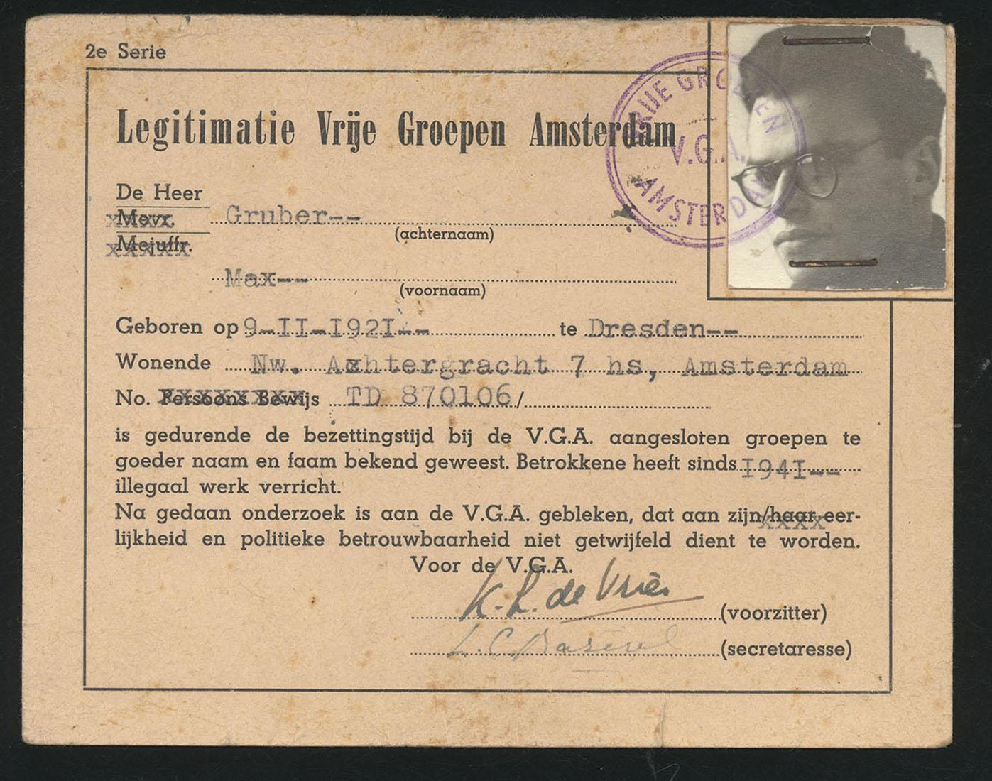 Legitimatie Vrije Groepen Amsterdam ten name van Max Gruber met verklaring dat hij sinds 1941 was betrokken bij illegaal werk, ca. 1945-1946