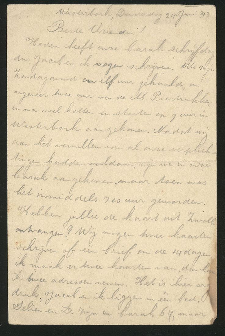 De brief is vermoedelijk geschreven door Izadoor van Oosten (1899-1943). De schrijver van de briefkaart heeft het erover dat hij met Jacob in één bed slaapt. Dit is vermoedelijk zijn zoon Jacob (1928-1943). Ook wordt ene Selien genoemd. Dit zou dan zijn vrouw Selina van Oosten-Roodveldt (1903-1943) kunnen zijn. De tweede briefkaart is op dinsdag 6 juli 1943 vanuit de trein geschreven. Dit zou kloppen met het gegeven dat Izadoor en zijn gezin drie dagen later in Sobibor is vermoord.