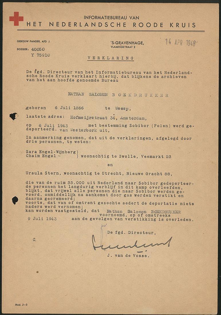Verklaring van het Ned. Rode Kruis met betrekking tot de dood door verstikking van Nathan Salomon Boekdrukker in Sobibor op of omstreeks 9 juli 1943