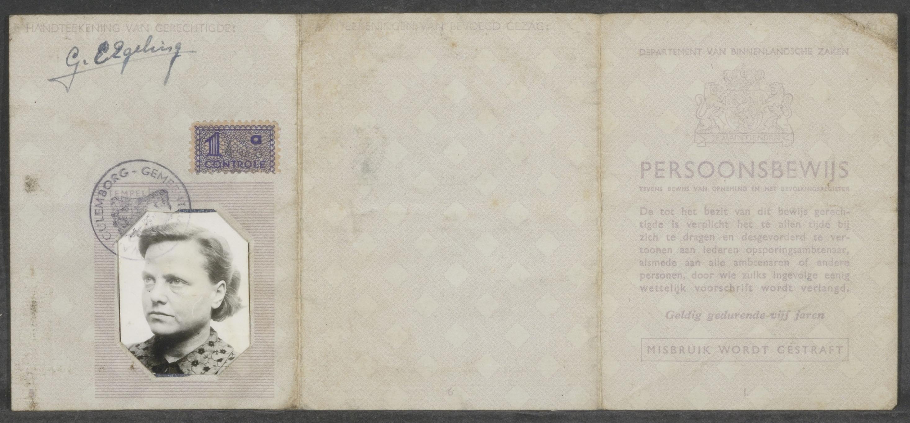 Bevat een vals persoonsbewijs van Truitje van Lier op de naam Geertruide Cornelia Egeling, een identiteitsbewijs op eigen naam, een paspoort. een briefkaart gericht aan Trui en een inentingsbewijs.