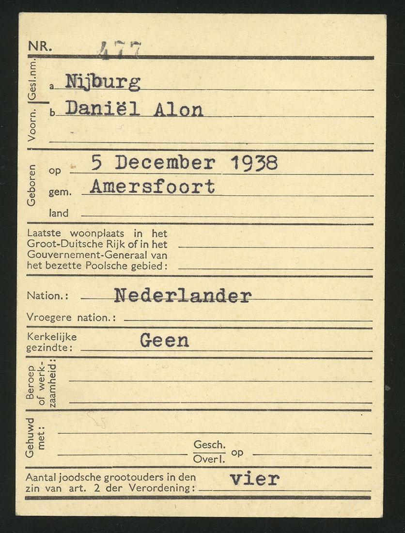Aanmeldingsbewijs als joods persoon ten name van Daniël Alon Nijburg (1938), 1941