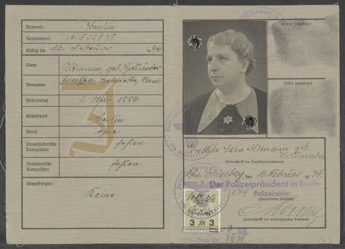 Bevat een Duits paspoort met een "J", een identiteitsbewijs met een "J", een registratiekaart van de Unie van Suid-Afrika, een identiteitsbewijs idem en een verblijfsvergunning idem.