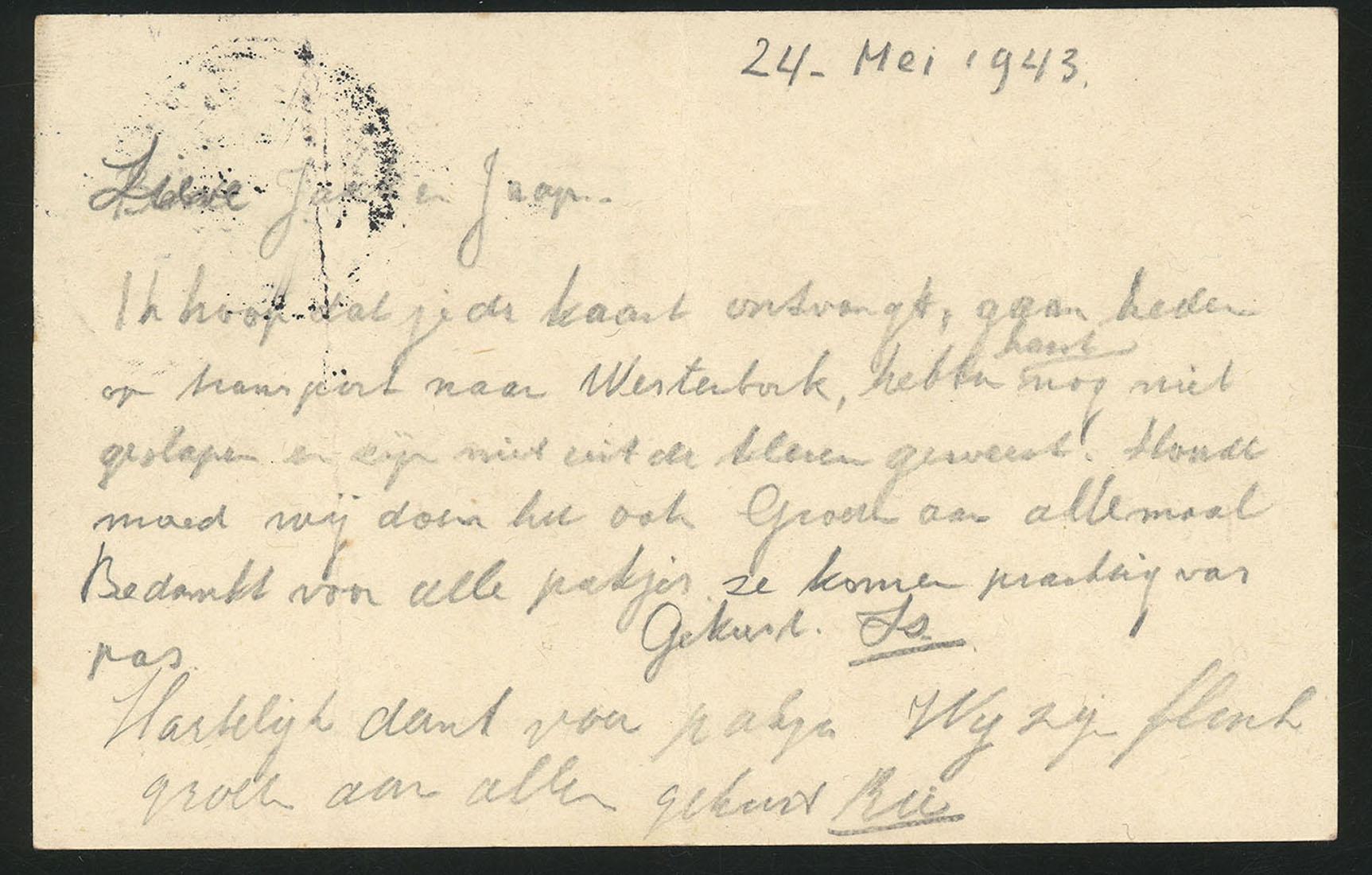 Twee uit de trein gegooide briefkaarten van Israël Querido (1908-1943) en zijn vrouw Marie (Rie) Querido-te Korte aan zijn broer Jacob Querido (1910) en diens vrouw, 1943