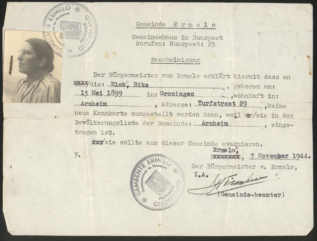 Verklaring van de gemeente Ermelo dat Rika Blok dat zij uit Arnhem geevacueerd is, 1944