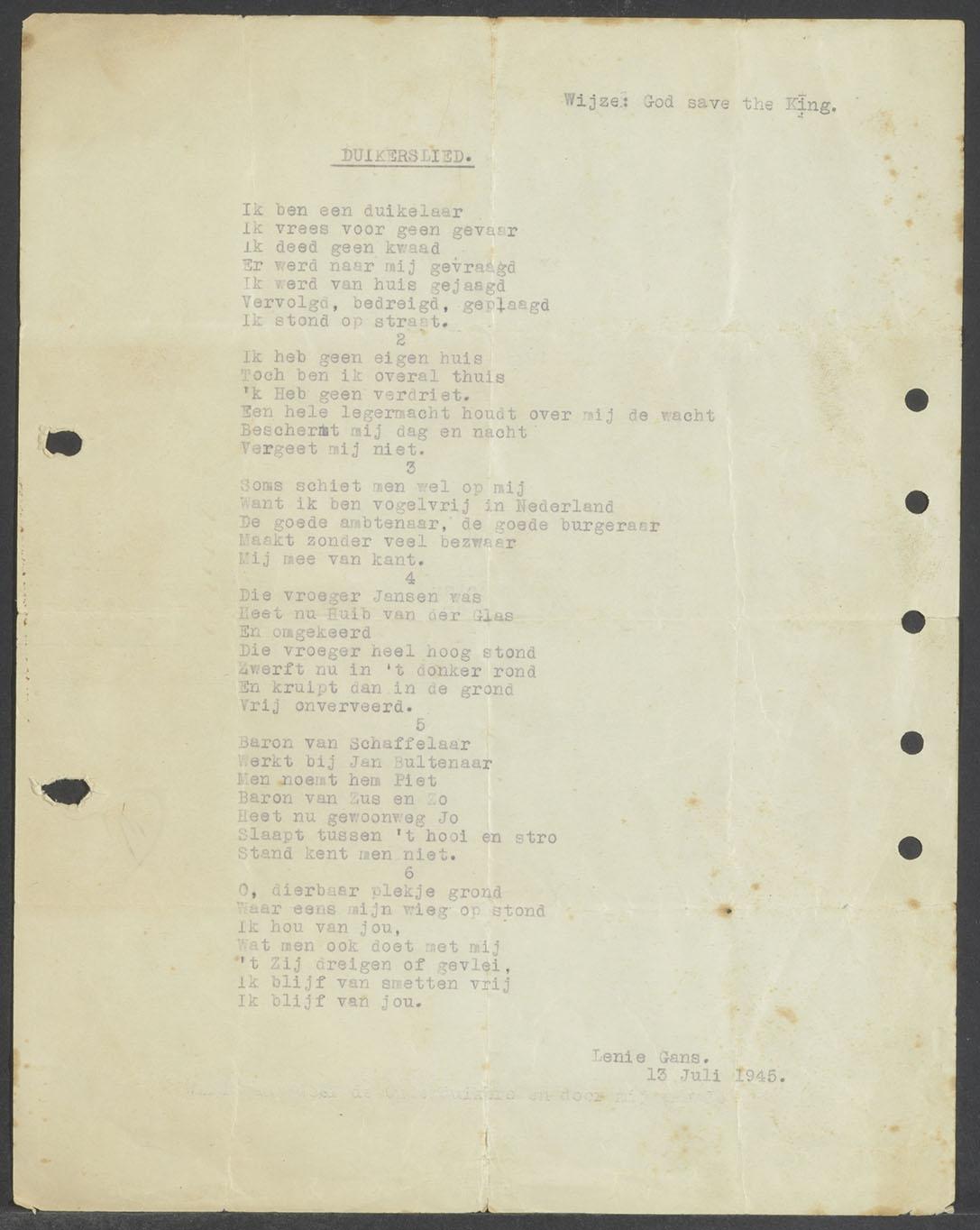 Typoscript van een gedicht getiteld "Duikerslied" geschreven door Lenie Gans, 13 juli 1945