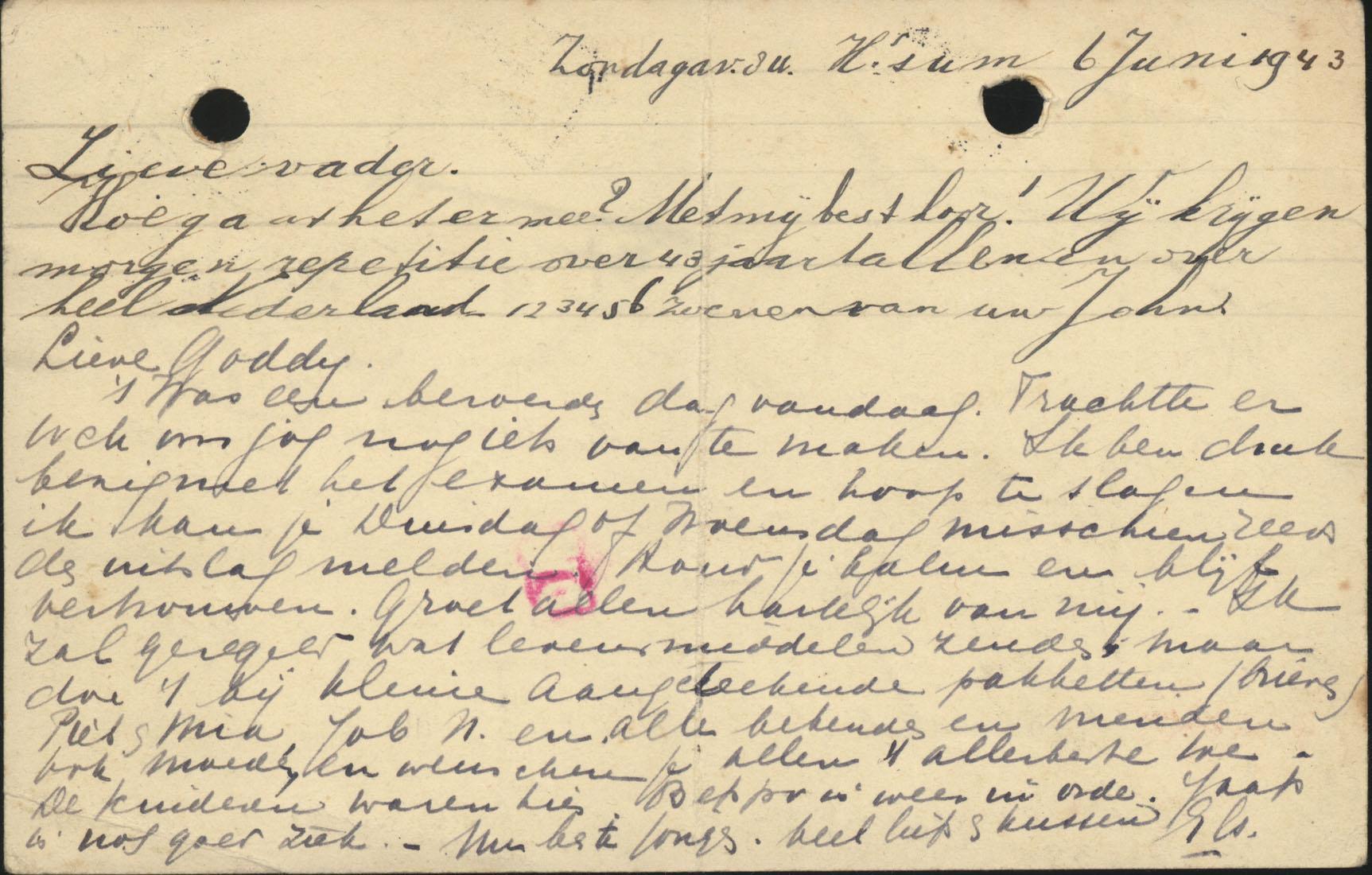 Een briefkaart is volgeschreven door zoon John Henry en zijn moeder en door het echtpaar Beppo en Lout; de andere briefkaart is door Selli Trisker-Hecht in het Duits geschreven vanuit barak 17 in Westerbork en gericht aan Elsa Benjamins-van de Poll; daarin vraagt Selli of Elsa iets gehoord heeft van haar man Jacob Benjamins die tot voor kort eveneens in Westerbork verbleef.