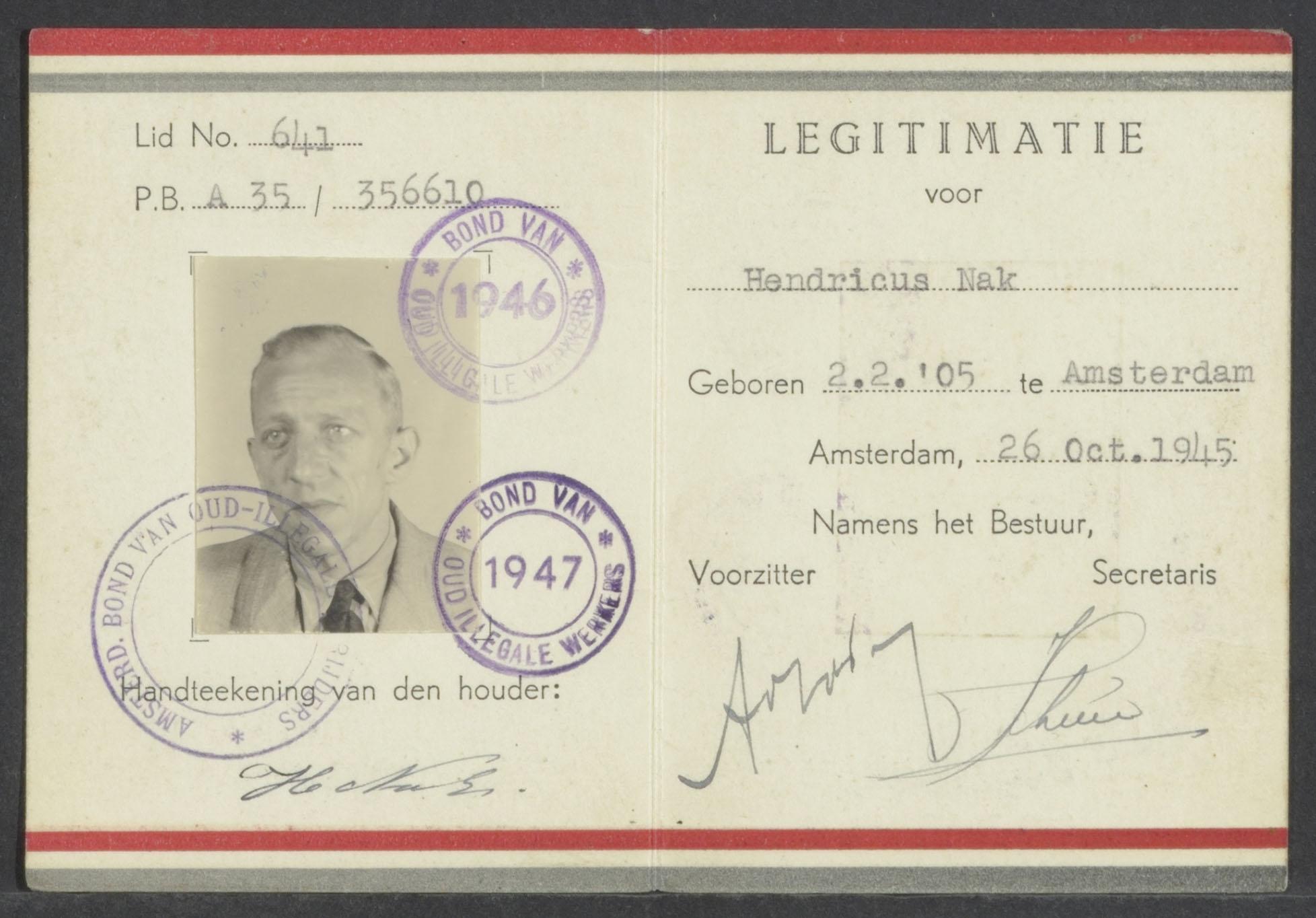 Legitimatiebewijs van de Amsterdamsche Bond van Oud-Illegale Strijders ten name van Hendrikus Nak, 1945