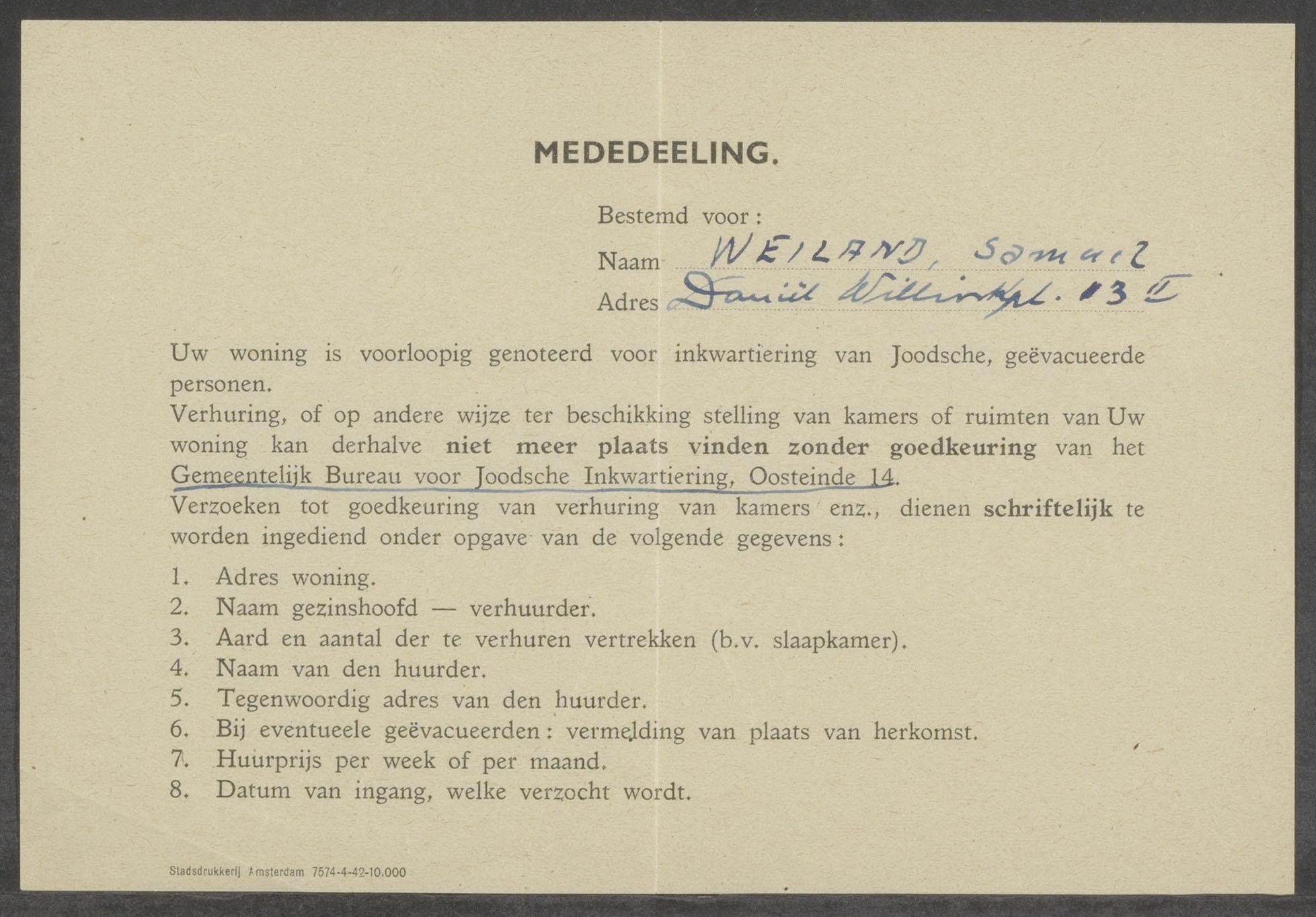 Omvat: 1. mededeling van het Gemeentelijk Bureau voor Joodsche Inkwartiering 2. inkwartieringsbiljet van de Gemeente Amsterdam met de namen van de personen die ingekwartierd worden bij de familie Weiland (5 mei 1943) 3. brief van N.V. Bouwmij Nipri inzake verwarming Daniel Willinkplein 15 t/m 35 4. voorlopig bewijs van de Gemeente Amsterdam 5. lijst van waardepapieren van Samuel Weiland (in het Duits) september 1939 6. kaartje met vermelding ingeleverde metalen 7. ontvangstbewijs van de Joodse Raad voor Amsterdam afd. Ondersteuning en Maatschappelijk Werk 8. drie aangiftes voor de inkomstenbelasting van Samuel Weiland, 1941-1942 9. brief van accountant J.M. Frenkel uit naam van zijn cliënt Samuel Weiland aan de PTT betreffende afsluiting telefoon 10. brief (in klad en getypt) van Samuel Weiland aan het Gewestelijk Arbeidsbureau met het verzoek om vrijstelling van tewerkstelling in werkkamp (10 september 1942) 11. twee bewijzen van betaling voor zitplaatsen in de synagoge Lekstraat (april 1942) 12. brieven en briefkaarten uit Antwerpen van Jacques Weiland en uit Polen 13. twee bewijzen van ontvangst van een pakje van Samuel Weiland, verstuurd vanuit concentratiekamp Vught 14. blad met handgeschreven tekst van het Hatikva in Hebreeuws en Duits