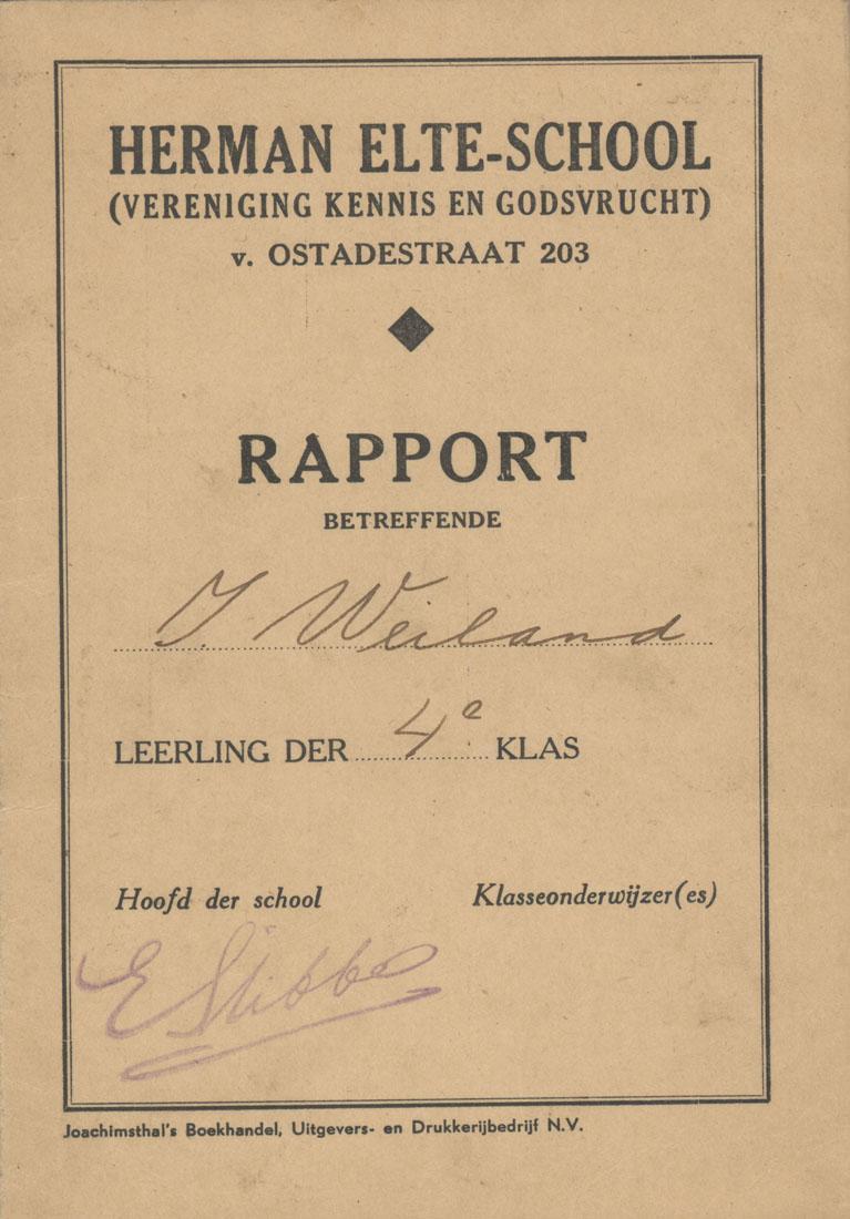 Omvat: 1. rapporten (2) van de 4e en 5e klas Herman Elte-School ondertekend door het schoolhoofd E. Stibbe 2. voorlopig bewijs van de Gemeente Amsterdam 3. bewijs van aanmelding 10 april 1942 Gemeente Amsterdam 4. briefkaart van vriend Frits uit Dalfsen met rijmpje en tekening, 13 september 1942 5. brief van Ies aan zijn zus Marga, geschreven vanuit Amsterdam op 10 mei 1943 6. briefje (met stempel van de Joodse Raad Jan van Eyckstraat 15) van Ies vanuit Westerbork barak 35 met verzoek om kleding, 8 mei 1944 7. met potlood geschreven briefje (postpapier van kamp Westerbork en stempel 'Geprüft') van Israel Weiland vanuit barak 35 Westerbork aan Barend Buitenkant te Amsterdam, 16 mei 1944 8. verklaring van het Nederlandse Rode Kruis dat Israel Weiland op 19 mei 1944 is gedeporteerd en rond 22 mei 1944 in Auschwitz is omgebracht 9. nota van de toenmalige belastingdienst op de nalatenschap van Israel Weiland voor Margalith Weiland, 16 november 1955 10. boete van de belastingdienst wegens het niet tijdig voldoen van het successierecht inzake de nalatenschap van Israel Weiland, 3 januari 1956