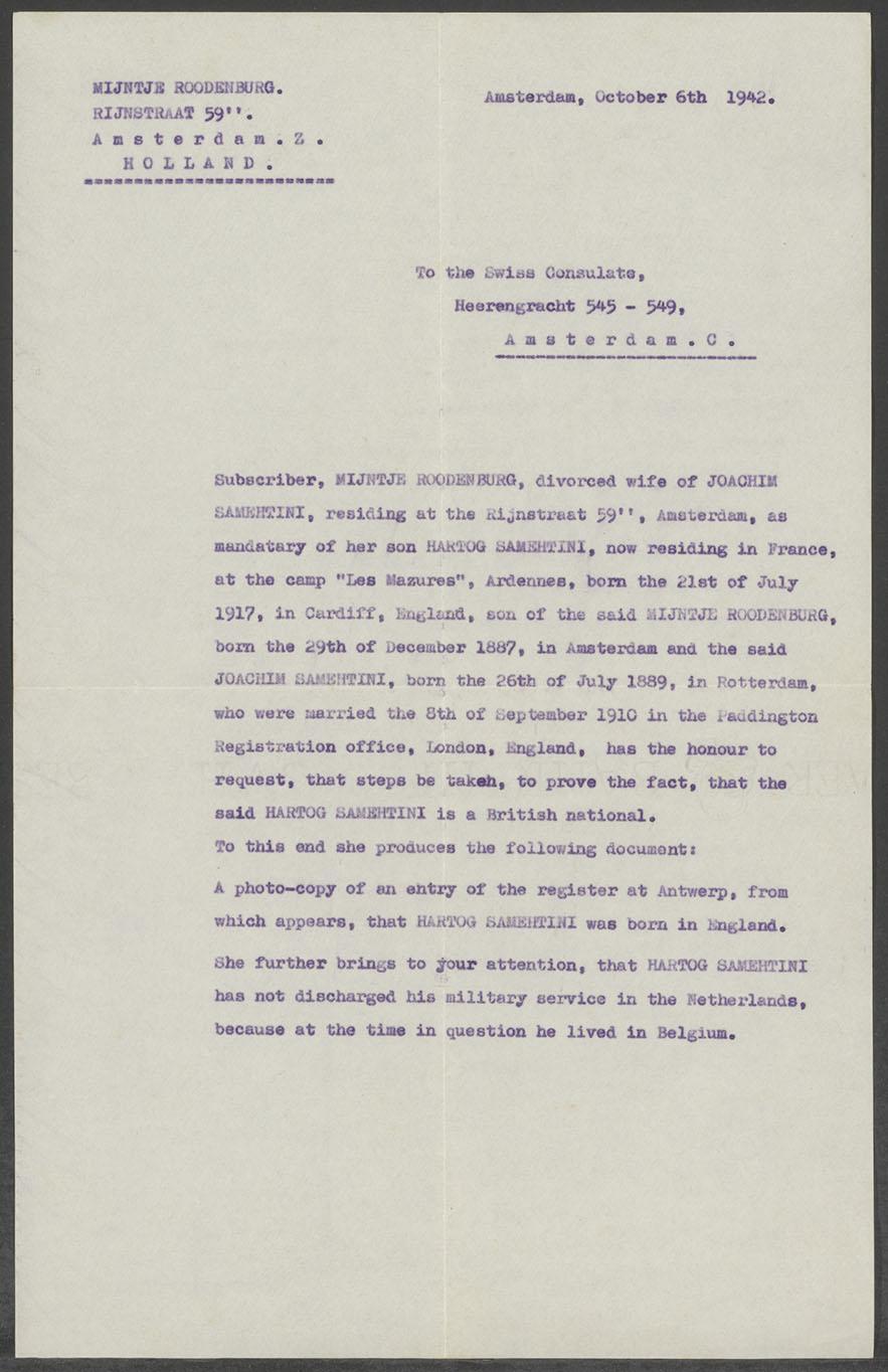 Brieven van Mijntje Roodenburg aan het Zwitserse Consulaat en brieven van officiële instanties aan Mijntje Roodenburg inzake de Engelse nationaliteit van haar zoon Hartog Samehtini, 1942