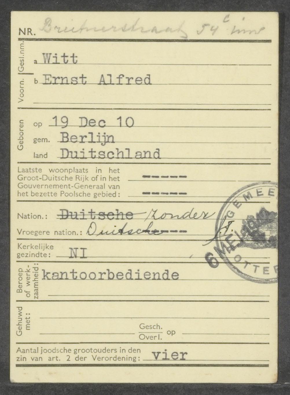 Ontvangstbewijs als joods persoon ten name van Ernst Alfred Witt, 1941