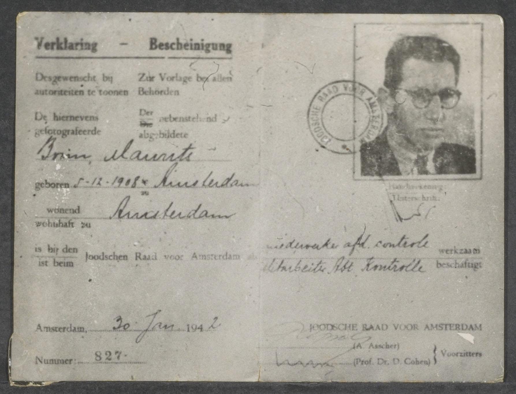 Contemporaine kopieën (2) van verklaringen dat Maurits Bonn bij de Joodse Raad werkzaam is, 1942