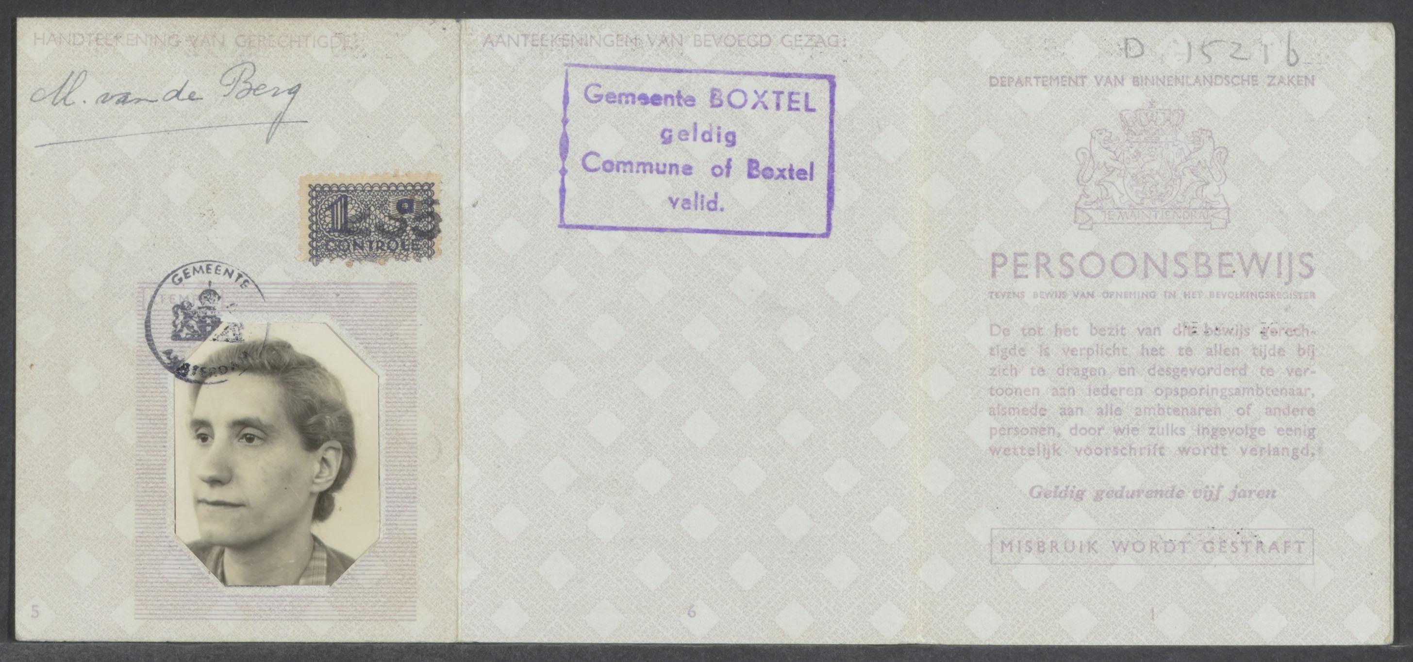 Persoonsbewijs (vals) van Albertina Katan-Vogel op naam van Maria van de Berg, 1944