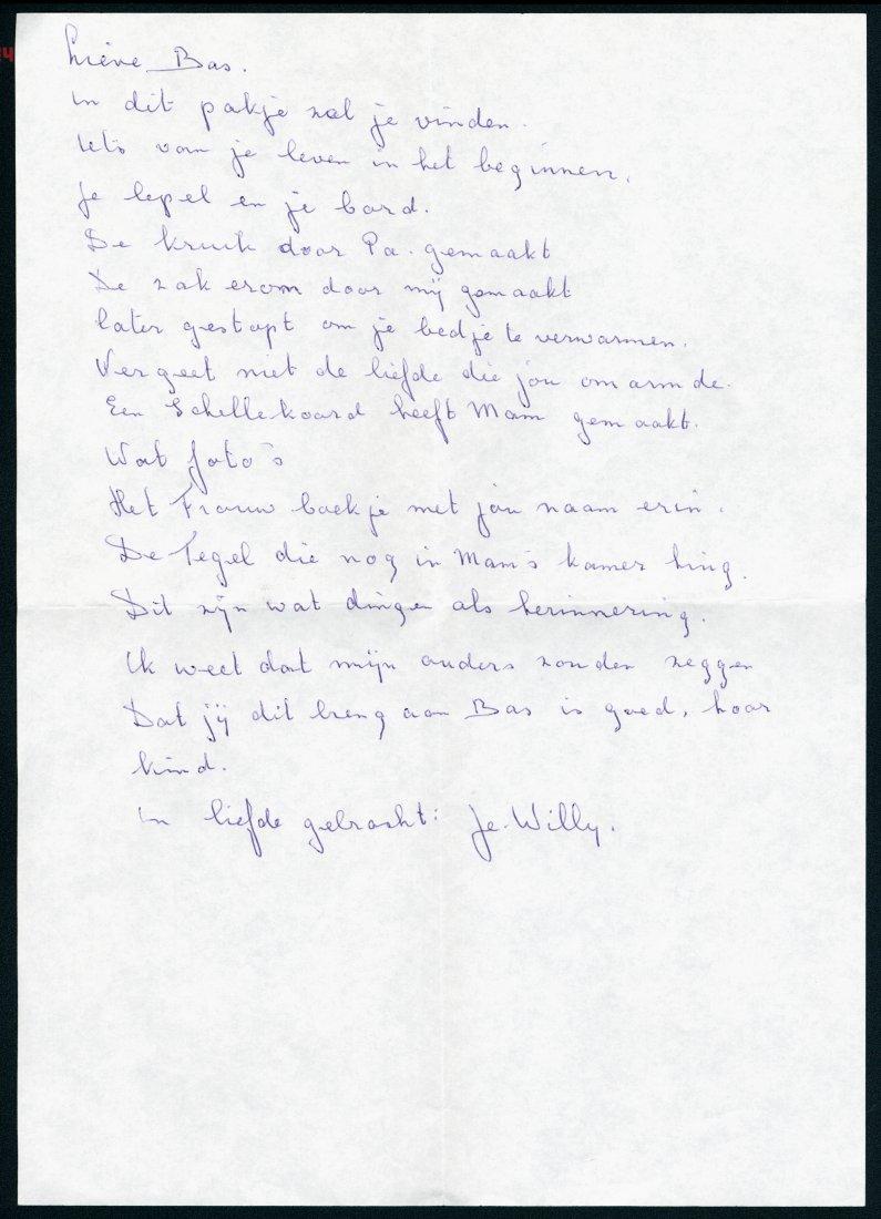 Brief op rijm, met enveloppe, waarin Willy Borgstein, onderduikzus van Bas van Gelder, hem foto's, documenten en voorwerpen aanbiedt uit de tijd die hij als ondergedoken kind bij de familie Borgstein doorbracht