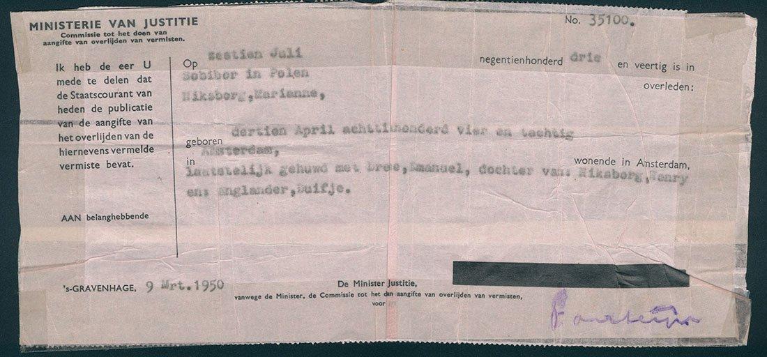 Mededeling van het Ministerie van Justitie dat aangifte is gedaan van het overlijden van de vermiste persoon Marianne Niksborg die op 16 juli 1943 in Sobibor is overleden,1950