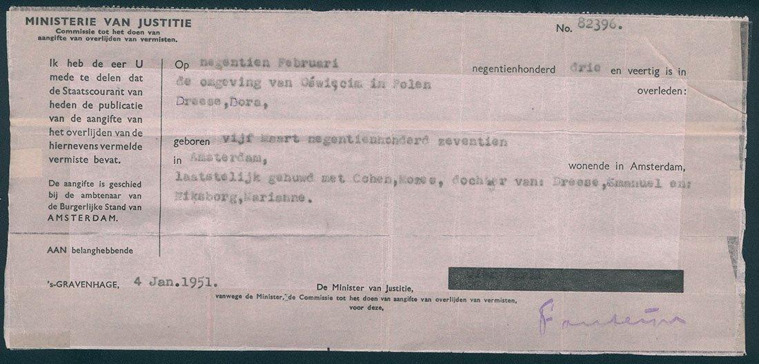 Mededeling van het Ministerie van Justitie dat aangifte is gedaan van het overlijden van de vermiste persoon Dora Dreese die op 19 februari 1943 in Sobibor is overleden,1950