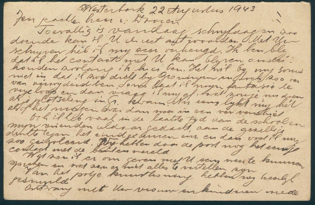 Briefkaart uit Westerbork van Robert Fried aan de heer P.H.E. van Dooren in Groningen, 1943